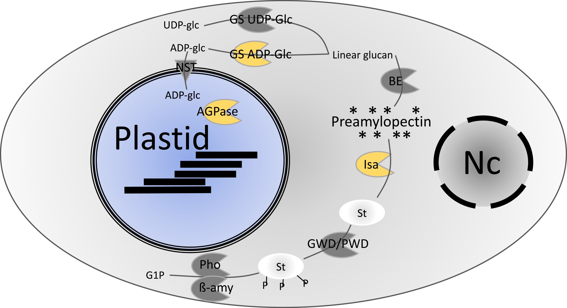 Simplified view of the proposed metabolic reconstruction of the function of starch metabolism in the last Archaeplastida common ancestor, based on [62, 63]. Origins of the various enzymes are indicated with different colours, grey indicates a protein from host origin, while yellow indicates a protein from bacterial origin. Synthesis of the bacterial specific nucleotide-sugar ADP-glucose occurs in the cyanobiont. ADP-glucose is then exported from the plastid to the host cytosol through a host encoded NST transporter, where it is used by a bacterial glucan synthase using ADP-glucose. The latter consists of the ancestor of SSIII/SSIV starch synthase present in green plants and algae and in glaucophytes. This flux is combined to the cytosolic eukaryotic flux that relies solely on UDP-glucose through a UDP-glucose specific glucan synthase of host origin found in both glaucophytes and red algae. The linear glucans are then branched into preamylopectin. The step performed by isoamylase (Isa) consists in trimming the soluble preamylopectin precursor, thereby leading to crystallization and aggregation of the starch granule. Catabolism is first initiated by the two dikinases GWD and PWD, which destabilize the crystalline structure and allow degradation by β-amylase and glycogen/starch phosphorylase. Nc: Nucleus, BE: Branching enzyme, GS: Glucan synthase, AGPase: ADP-glucose pyrophosphorylase, Isa: Isoamylase, GWD/PWD: Glucan/Phosphoglucan Water Dikinase, Pho: Glycogen phosphorylase, β-amy: β-amylase, G1P: Glucose-1-phosphate, NST: nucleotide sugar transporter, ADP/UDP-glc: ADP/UDP glucose.
