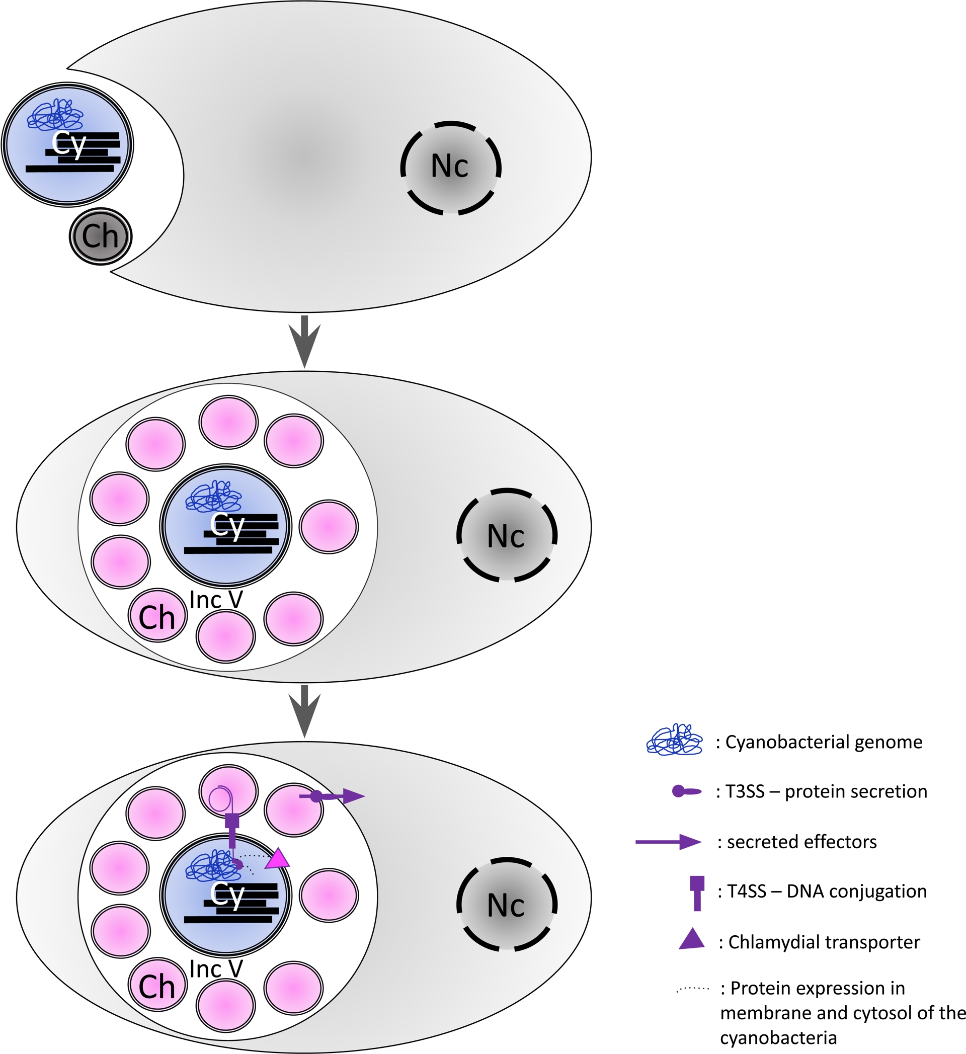 Simplified representation of the MATH (Ménage à Trois Hypothesis) suggested in [107]. Chlamydia and cyanobacteria were engulfed together leading to the localization of the cyanobacteria inside the chlamydial inclusion. This allowed two important types of transfers for plastid symbiosis: (i) Protein secretion in the host cytosol through the chlamydial type III secretion system (T3SS), which allowed to hijack host metabolism. (ii) Direct conjugation through the type 4 secretion system (T4SS) between chlamydia and cyanobacteria, allowing for direct gene transfer leading to the programmed enslavement of cyanobacterial metabolism, and transport of various metabolites inside the inclusion. This led to direct exchange between host, cyanobacteria, and chlamydia. Nc: Nucleus, Cy: Cyanobacteria, Inc V: Inclusion vesicule, Ch: Chlamydial cell.