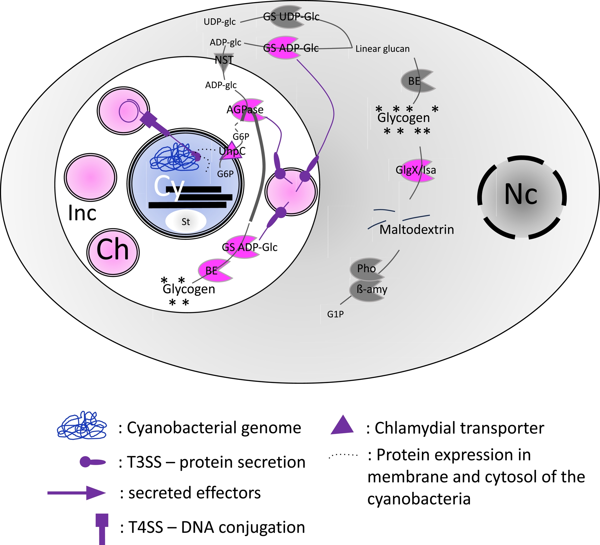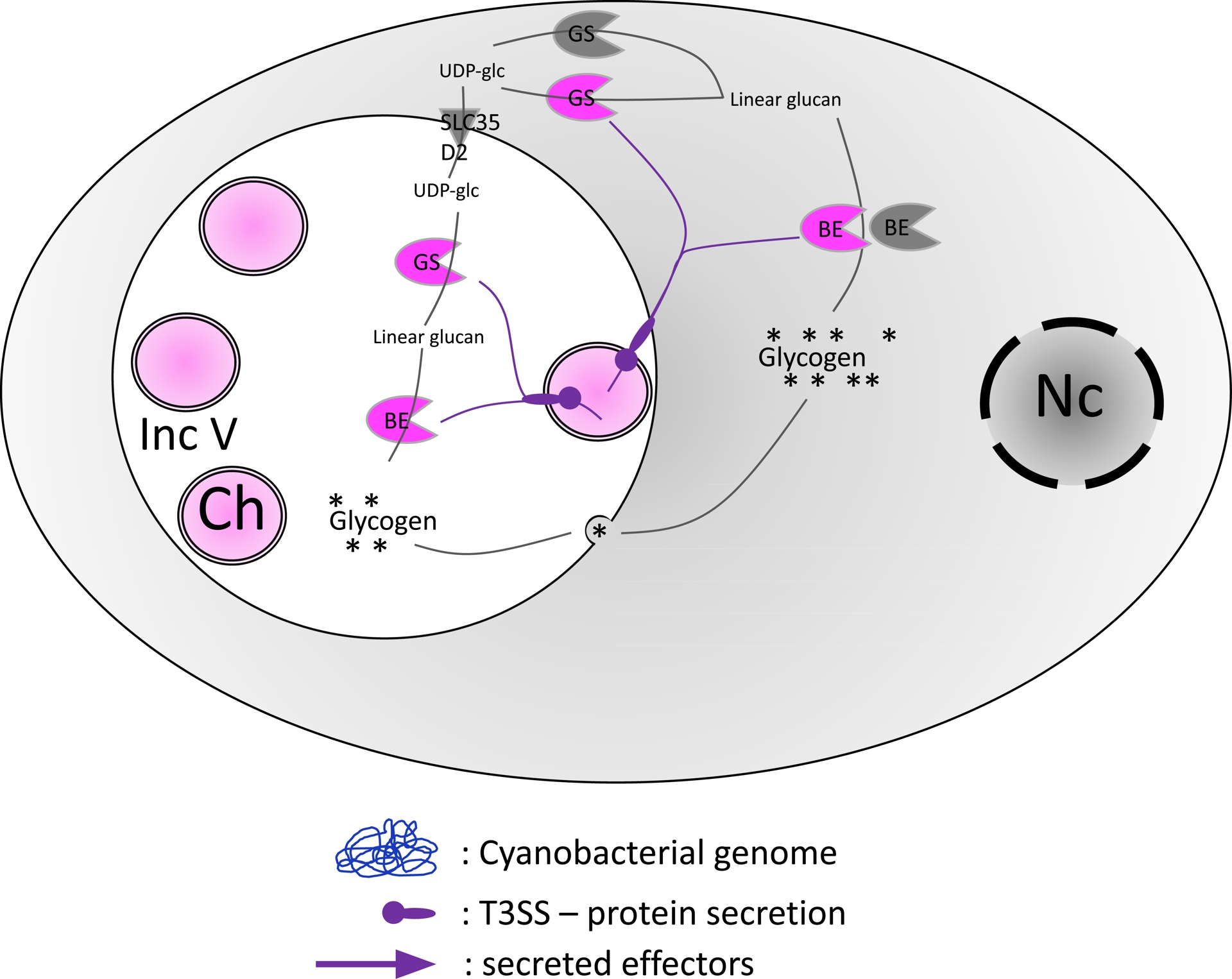 However, while SSIII/IV was originally thought to be of cyanobacterial phylogeny [62], subsequent analysis rejected a cyanobacterial ancestry for this enzyme, while displaying a surprising, likely chlamydial origin [66]. Because the SSIII/IV enzyme seems to be at the core of the symbiotic connection, it was proposed that it was present in the cytosol of the host at the onset of the process. To achieve this, it was suggested that glycogen metabolism enzymes were, in fact, cytosolic effectors secreted by Chlamydiae in the cytosol of their hosts, to manipulate the host carbon fluxes at their advantage. Glycogen metabolism, prior to these studies, had never been viewed as a provider of effector enzymes. Glucose storage had mainly been considered as an intra-chlamydial housekeeping function, and therefore not concerned with highly specialized biotic interactions of the chlamydial growth cycle.
