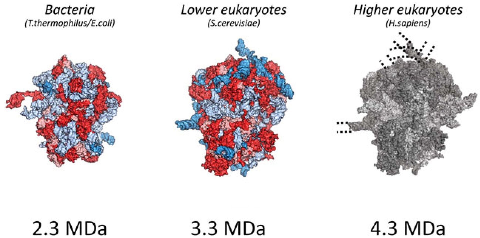 A genome sequence comparison of ribosomal RNA from different kingdoms indicates an extension of the rRNA as the complexity of the organisms increases (Armache et al., 2010a; Armache et al., 2010b). Among the eukaryotes, the mass of the ribosome varies from 3.3 MDa in unicellular eukaryotes to 4.3 MDa in humans (Figure 1). This difference is mainly due to the enlargement of four specific expansion segments distributed across the rRNA (Hariharan et al., 2023). The expansion segments are generally located at the solvent surface and do not directly interact with ribosome functional sites (Armache et al., 2010a; Taylor et al., 2009; Ben-Shem et al., 2011). Even though the locations of the insertion sites of the expansion segments coincide, their length and nucleotide composition differ among eukaryotes: ESs are generally more GC-rich in vertebrates than in invertebrates and unicellular eukaryotes (Armache et al., 2010a; Armache et al., 2010b).