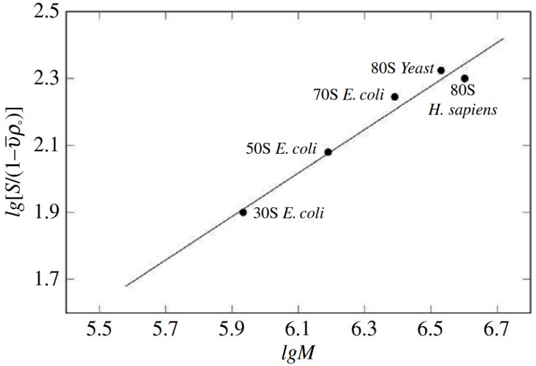 Dependence of the sedimentation coefficient of the ribosome particle on molecular weight. Graphic kindly provided by S. Agalarov.