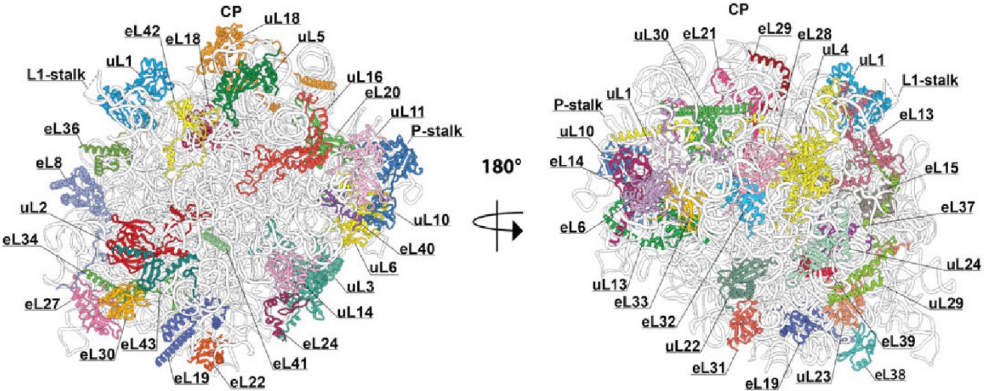 Structure of G. gallus ribosomal 60S subunit. Ribosomal RNA is shown in grey and ribosomal proteins in color. The left side represents the ribosomal interface, while the right side represents the ribosomal solvent side.