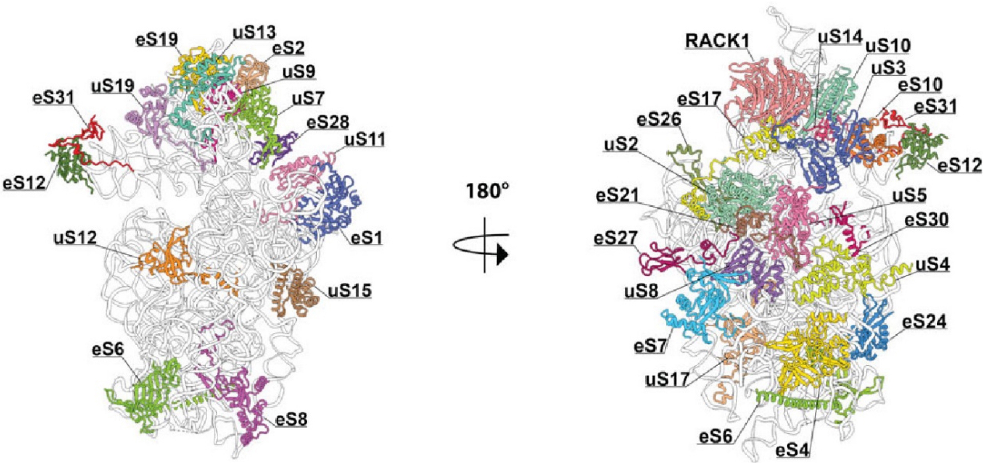 Structure of the G. gallus ribosomal 40S subunit. Ribosomal RNA is shown in grey and ribosomal proteins in color. The left side represents the ribosomal interface, while the right side represents the ribosomal solvent side.