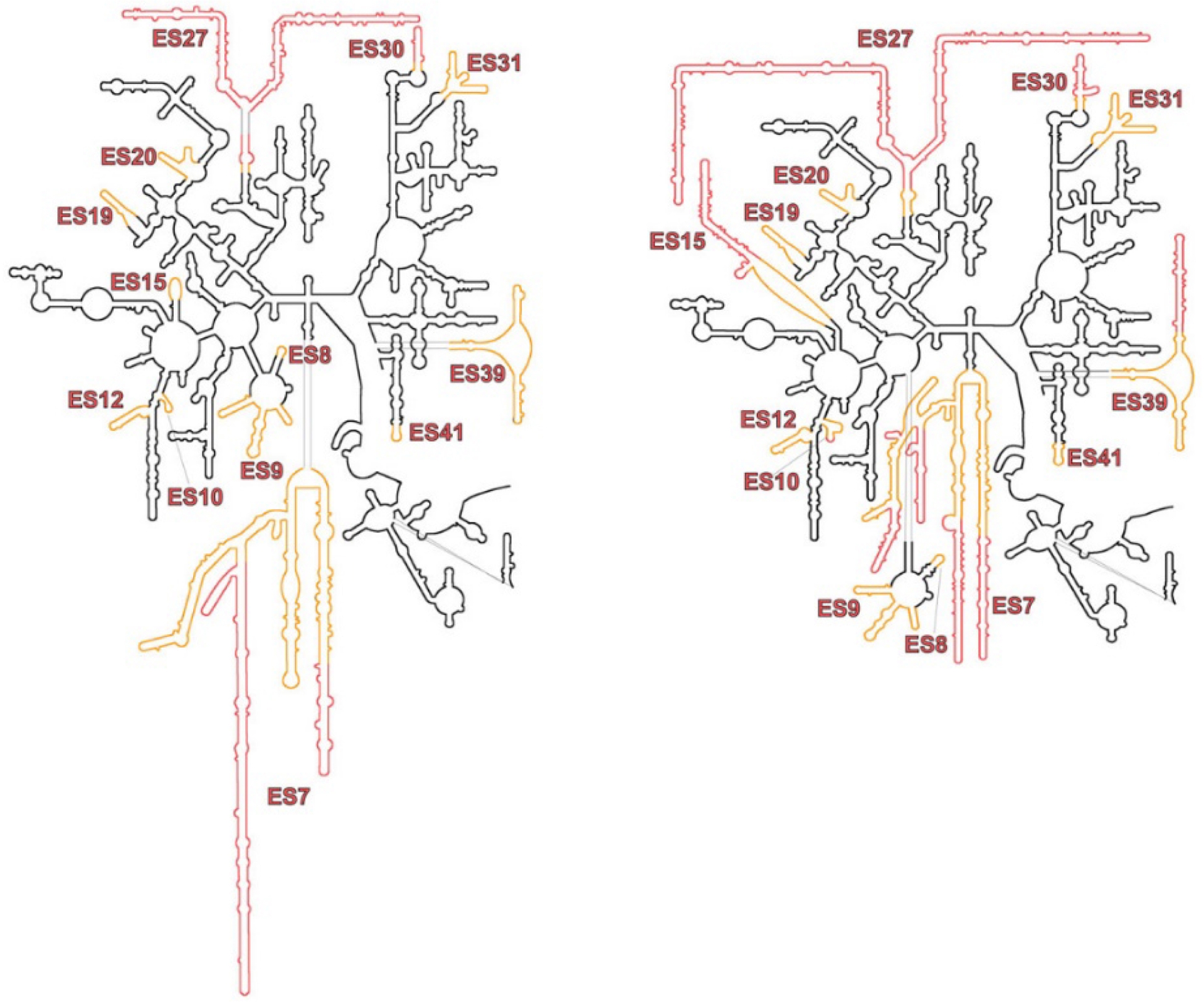Secondary structure of 28S rRNA: on the left, the secondary structure from Gallus gallus; and on the right, the one from Homo sapiens. In black are the rRNA conserved between the two species. Expansion segments are represented in yellow/red color. Rred indicate the parts of expansion segments which are flexible and not visible in cryo-EM three-dimensional structure.