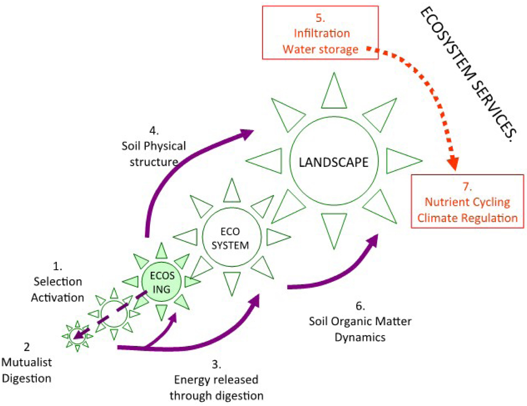 Interactions among self-organized units across scales and the delivery of ecosystem services. Ecosystem engineers select and activate microbial communities in their functional domains (1). A mutualist digestion system (2) releases energy (3) used by ecosystem engineers to build biogenic structures and organize soil physical structure (4) with resulting effects on water services (infiltration and storage) (5). The combination of mineralization processes during the digestion process and sequestration of organic compounds in biogenic structures affects soil organic matter dynamics (6), and hence, nutrient cycling and climate regulation (7). Note that additional scales such as biome and biosphere may be added when ecosystem services are considered at a global scale.