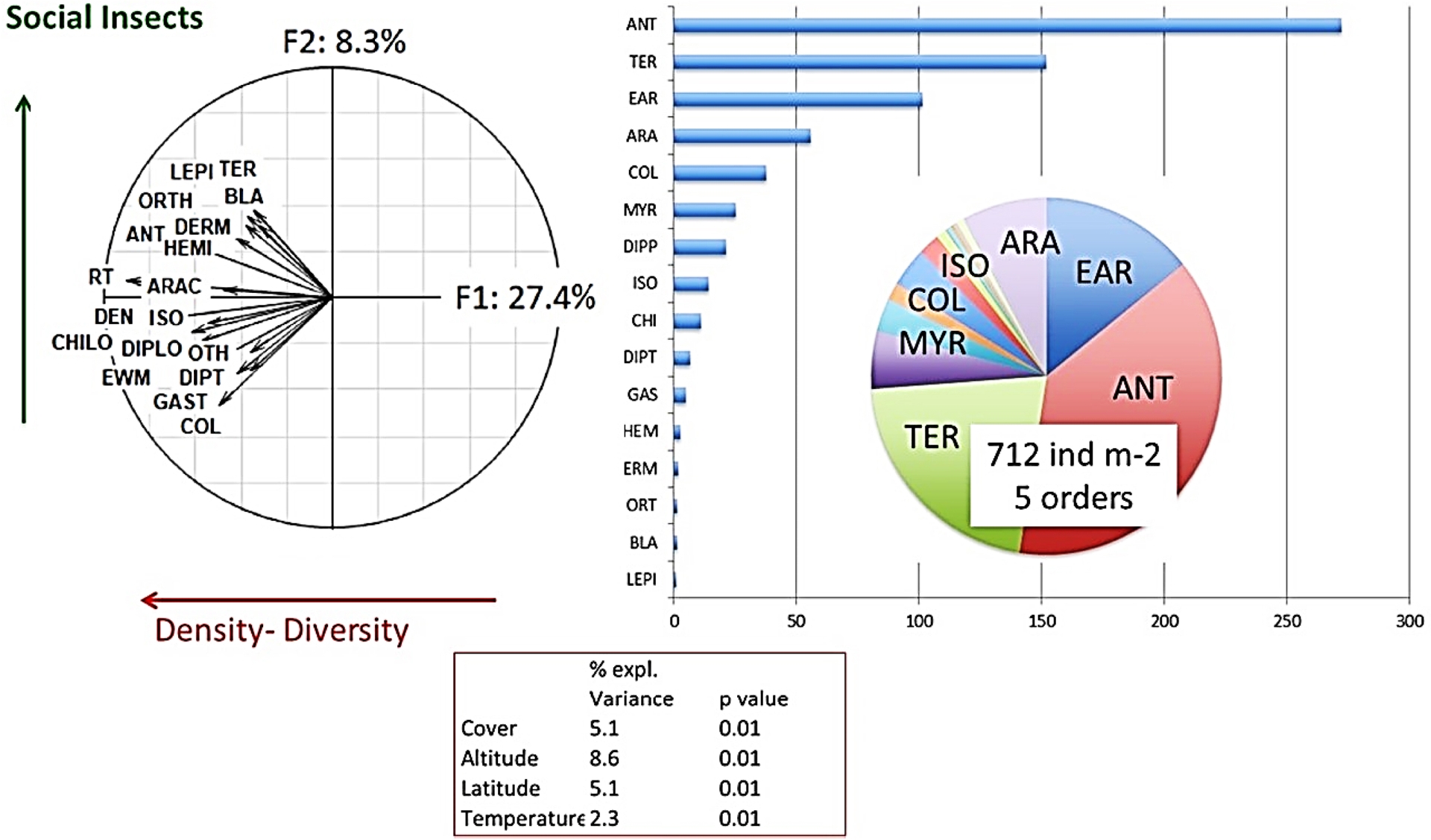 A principal component analysis (PCA) of an intermediate version of the database, with 3694 sites, gave the following general results (Figure 3). The “average” community sampled in all these sites comprised 712 individuals per m2 belonging to five different orders. The first factor of the PCA ordered communities according to the abundance of all groups, with a major effect of social insects and litter invertebrates. The second factor opposed sites with dominant social insect populations to other non-social taxonomic groups. Specific tests showed significant effects of all the environmental parameters tested: vegetation cover (11% of the total explained variance), latitude (8.6%), altitude (5.2%), soil texture (3.2%) or temperature (2.3%) (Lavelle, Mathieu et al., 2022).