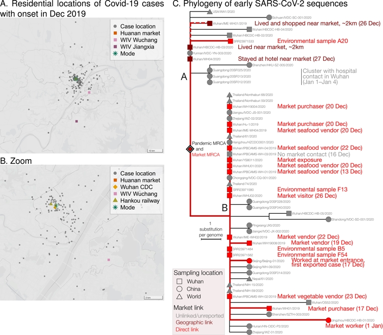Les données épidémiologiques et génomiques pointent vers le marché de Huanan. (A) Emplacements des lieux de résidence des cas de Covid-19 dont les symptômes sont apparus en décembre 2019 (points gris). L'étoile verte est le mode de la distribution des cas (c'est-à-dire l'emplacement du pic d'une estimation par noyau de la densité des lieux de résidence des cas, calculée comme dans Débarre and Worobey (2024a)). Sont indiqués les emplacements du marché de Huanan (carré rouge) et des deux campus de l'Institut de virologie de Wuhan : le campus historique du district de Wuchang (rose clair) et le campus plus récent du district de Jiangxia (rose foncé), où se trouve le laboratoire de niveau de biosécurité 4 (BSL4). Données sur les cas de World Health Organization (2021), extraites par Worobey et al. (2022), mises à jour avec les cas du Hubei en dehors de Wuhan ; figure adaptée de Débarre and Worobey (2024a). ((B) Détail de la carte A près du marché, montrant deux points de repère supplémentaires : la gare de Hankou (triangle vert olive) et le nouvel emplacement du CDC de Wuhan (losange orange). (C) Phylogénie des séquences précoces du SARS-CoV-2, montrant les deux principales lignées précoces, A et B. Figure adaptée et mise à jour à partir de suite à la suppression des doublons et des nouvelles annotations identifiées par Crits-Christoph, Levy, et al. (2024) suivant l’identification de doublons par Hensel and Débarre (2025). Les séquences liées au marché sont indiquées en rouge ; le rouge foncé correspond aux liens géographiques (proximité spatiale) avec le marché.