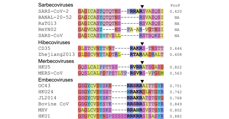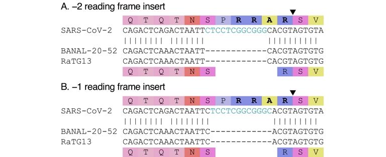 Par comparaison avec ses plus proches parents connus, le site de clivage par la furine du SARS-CoV-2 est dû à une insertion. Cette insertion est représentée en bleu dans la séquence nucléotidique (deux positions de l’insertion sont possibles) ; elle conduit à la formation d'un site de clivage par la furine dans le SARS-CoV-2 (indiqué en gras dans la séquence d'acides aminés), mais ajoute également une proline (P) juste avant. Le triangle noir représente le site de clivage (indiqué une seule fois pour chaque groupe d'alignement). Par rapport aux virus connus, l'insertion n’est pas en phase avec le cadre de lecture. En raison des « C » à chaque extrémité, des insertions décalées de −1 et −2 par rapport au cadre de lecture sont possibles.