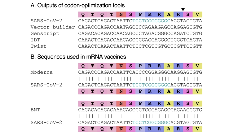 La séquence CGGCGG ne correspond pas à une optimisation des codons pour le codage de RR. Le triangle noir indiquant le site de clivage n’est montré qu'une seule fois. (A) Séquences obtenues à l'aide de divers outils d'optimisation des codons en ligne pour la séquence d'acides aminés présentée. Les URL des différents outils sont indiquées dans la section Méthodes. (B) Fragments de séquence provenant des vaccins à ARNm Moderna (en haut) et Pfizer-BioNTech (BNT ; en bas).