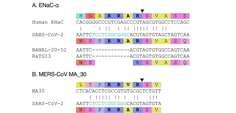 Il a été montré que la séquence d'acides aminés du SARS-CoV-2 au niveau de son site de clivage par la furine et à quelques positions au-delà correspondait à la séquence d'acides aminés d'une protéine épithéliale humaine appelée ENaC-𝛼 (Anand et al., 2020). La comparaison a été poussée plus loin en suggérant que l'ENaC-𝛼 aurait pu inspirer l'introduction du site de clivage par la furine non canonique RRAR (Harrison and Sachs, 2022). Au-delà de la correspondance entre les acides aminés, cette suggestion a été faite parce qu'un groupe de recherche de l'université de Caroline du Nord a étudié l'ENaC-𝛼 (bien qu'il s'agisse surtout de la version murine), et que cette même université abrite un autre groupe de recherche qui a collaboré avec le WIV. Enfin, certains soulignent qu'il existe huit acides aminés communs entre l'ENaC-𝛼 et le SARS-CoV-2.