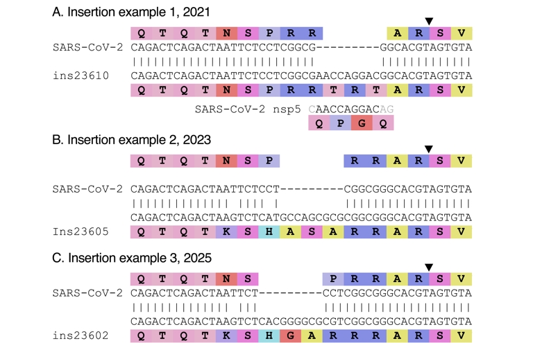 Des insertions ont eu lieu à plusieurs reprises au cours de l'évolution du SARS-CoV-2 chez les humains, y compris dans sa protéine Spike. Parmi les exemples notables, citons l'insertion EPE (à la position 214 de la protéine Spike) dans le variant Omicron BA.1 qui s'est propagé dans le monde entier à partir de fin 2021, et l'insertion MPLF (à la position 216 de la protéine Spike) dans la lignée descendant d'Omicron BA.2.86, qui a commencé à se propager au milieu de l'année 2023 et qui est toujours dominante à l'heure où nous écrivons ces lignes.