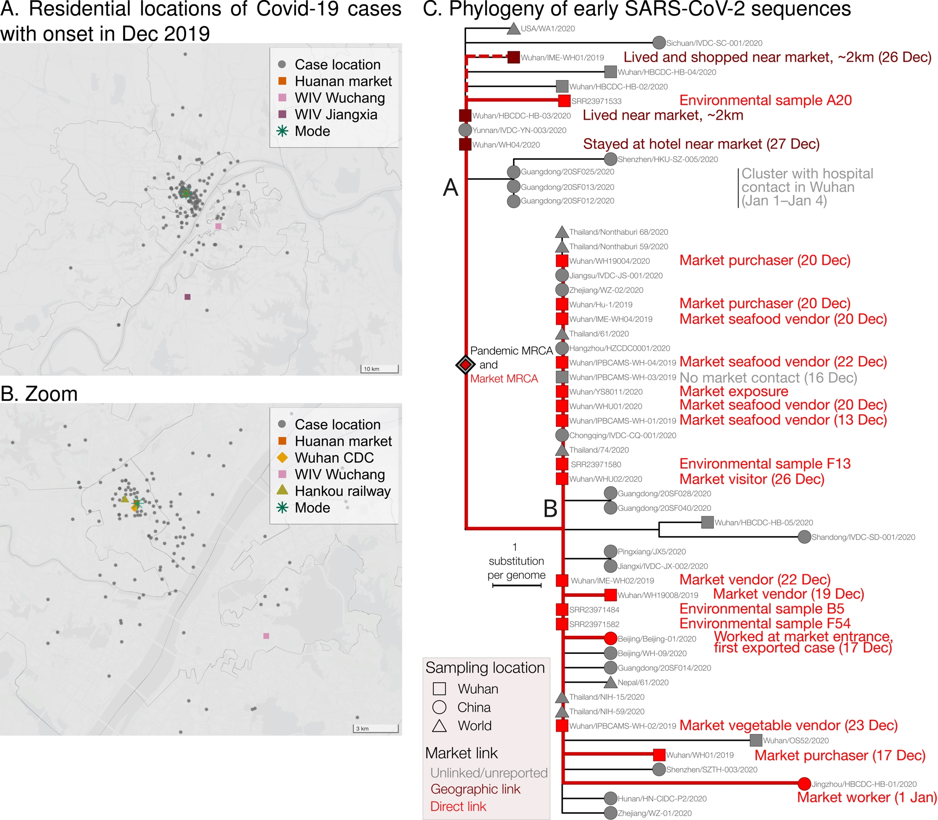 The Covid-19 pandemic was a major event in the history of the 21st century, and it is therefore important to understand what originally caused it. Available data, to date, point to a zoonotic origin linked to the wildlife trade at the Huanan market (Crits-Christoph, Levy, et al., 2024; Holmes, 2024), a conclusion supported by multiple lines of evidence. SARS-CoV-2 is a generalist virus, readily able to infect various mammal species (Nerpel et al., 2022; EFSA Panel on Animal Health and Welfare (AHAW) et al., 2023), and even to be transmitted among several of them, including raccoon dogs (Freuling et al., 2020, shown experimentally). Early human cases, with disease onset in December 2019, were retrospectively identified, and the locations of their residences mapped (World Health Organization, 2021). This revealed a striking pattern: the cases were centered around the Huanan market, whether they were epidemiologically linked to it (e.g., vendors or buyers), or not (Worobey et al., 2022; Débarre and Worobey, 2024a; Débarre and Worobey, 2024b) (see Figure 1A–B). The early lineages of SARS-CoV-2 (lineage B and lineage A (W. Liu et al., 2022)) were both present in the Huanan market, suggesting that they emerged, or at least evolved, there (see Figure 1C). Finally, live animals were sold in the Huanan market, including some species already involved in the 2002–2004 SARS epidemic (X. Xiao et al., 2021; Crits-Christoph, Levy, et al., 2024; W. J. Liu, P. Liu, et al., 2024). The stalls selling these animals were located in the southwest corner of the west wing of the market (G. Wu, 2020; World Health Organization, 2021), which was a hotspot of SARS-CoV-2 positivity (Worobey et al., 2022). Genetic material from both SARS-CoV-2 and from key animal species such as raccoon dogs and civets was detected in samples from the same stall (Crits-Christoph, Levy, et al., 2024).