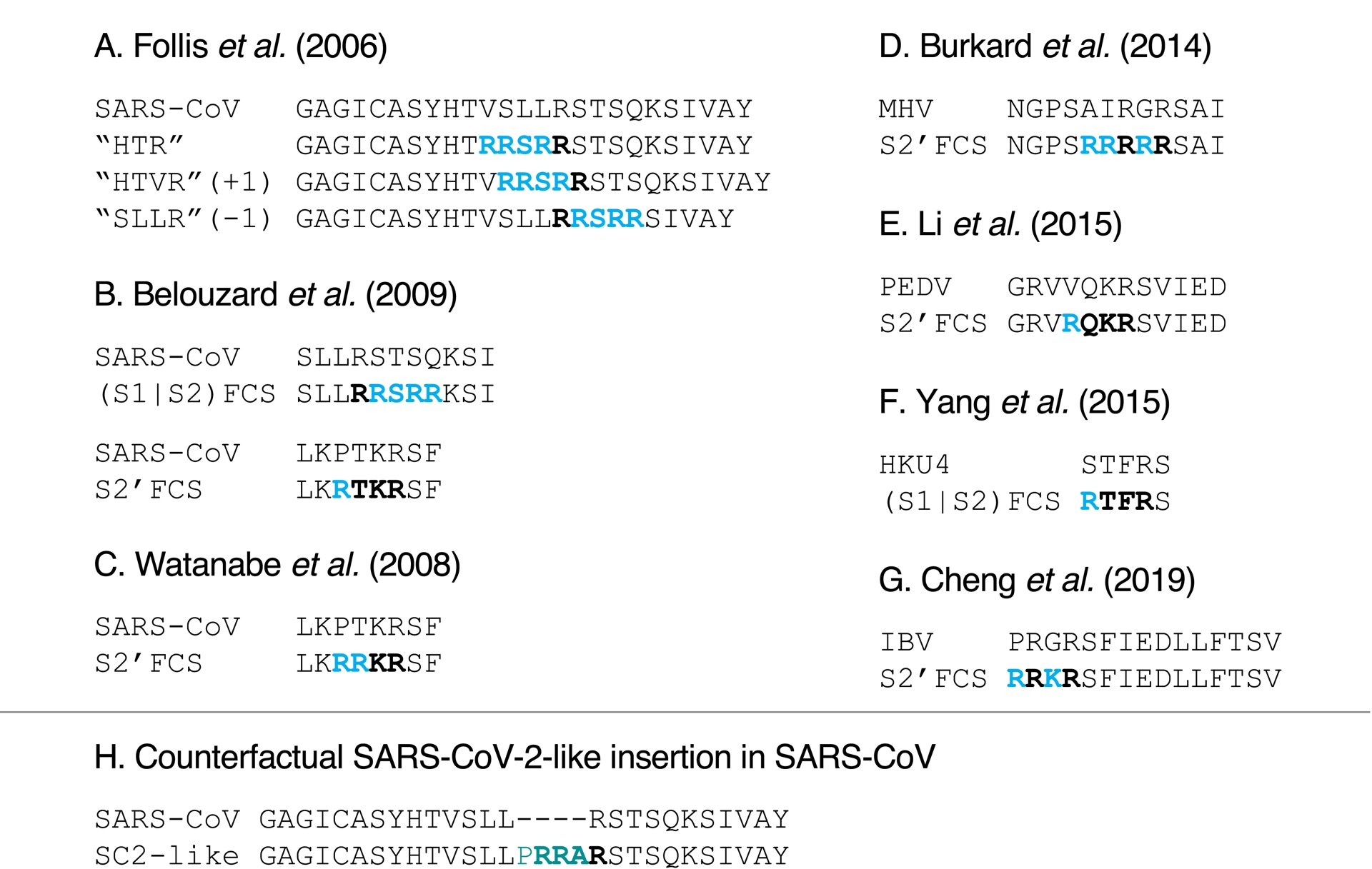 Closer inspection of the details of these experiments reveals that the introductions of furin cleavage sites were done very differently from how SARS-CoV-2’s is proposed to have been generated. As described above, compared to its known close relatives, SARS-CoV-2’s furin cleavage emerged by the insertion of 12-nucleotide sequence, encoding four amino acids (PRRA), including one (P) that was originally not part of the polybasic site. Previous experiments, on the other hand, did not introduce polybasic sites via such a large insertion, but instead did so by modifying existing sequences in place by point mutations (Figure 5A–G; occasionally removing or adding one amino acid, see Figure 5A). In addition, except when the mutations were meant to match another close coronavirus (changing HKU4’s sequence to resemble MERS-CoV’s (Y. Yang, C. Liu, et al., 2015, Figure 5F)), the introduced cleavage sites were canonical, i.e., R-X-(R/K)-R (where X is any amino acid), instead of the minimal R-X-X-R version found in SARS-CoV-2. Importantly, none of these experiments introduced amino acids outside of the polybasic site, unlike SARS-CoV-2’s leading proline (P). Even the experiment on HKU4, designed to resemble MERS-CoV’s polybasic site, did not introduce a proline (P), while there is one in MERS-CoV before its polybasic site (compare Figure 2 and Figure 5F). Figure 5H illustrates what an experiment on SARS-CoV matching SARS-CoV-2’s insertion would have looked like. Moreover, experiments with SARS-CoV (Follis et al., 2006; Belouzard et al., 2009; Watanabe et al., 2008) (and HKU4 (Y. Yang, C. Liu, et al., 2015)) were done with pseudotypes, not full viruses. These previous experiments are therefore actually arguments against an artificial origin of the 12-nucleotide insert in SARS-CoV-2.