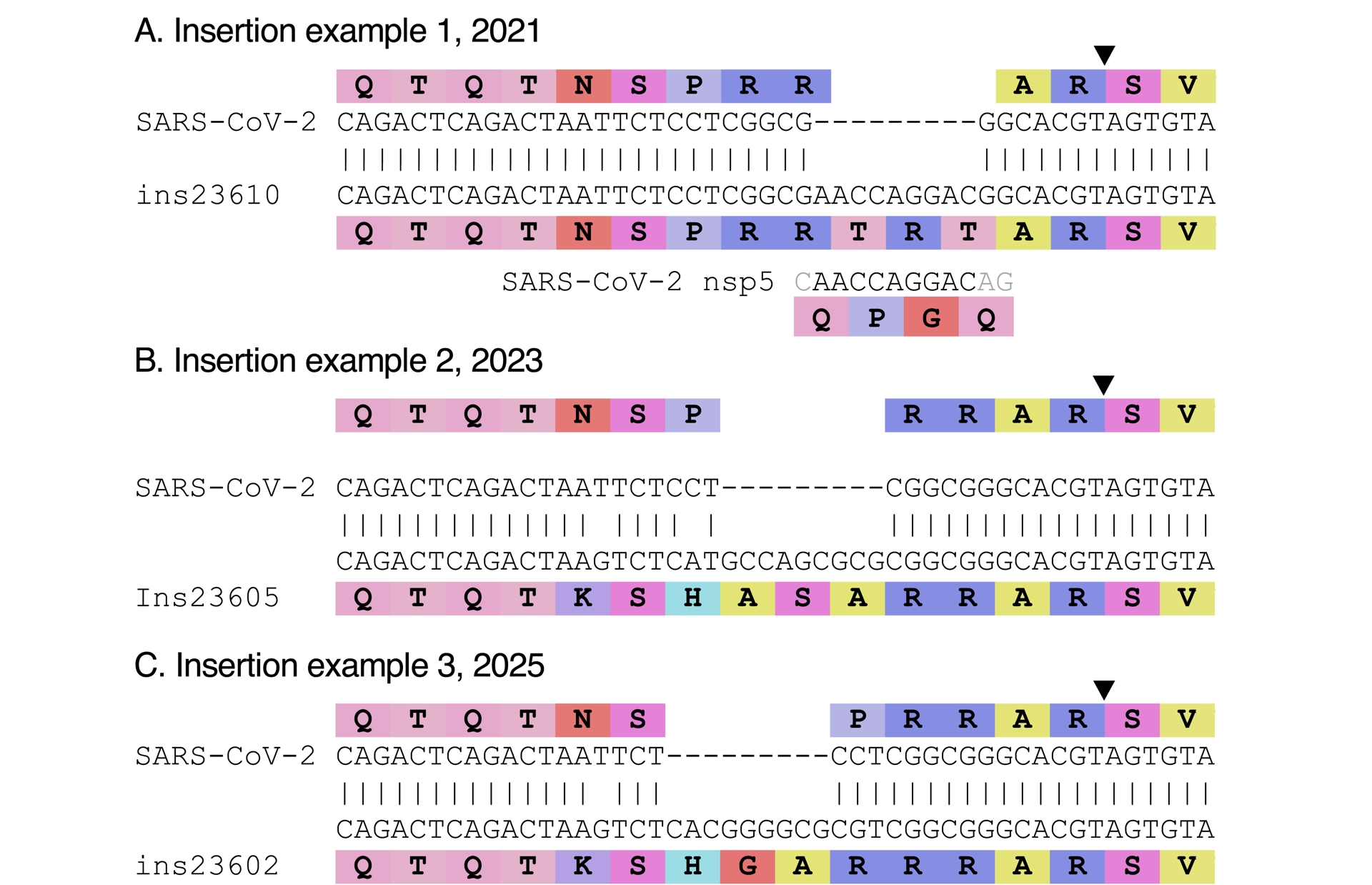 Examples of insertions in SARS-CoV-2 near the cleavage site (represented by a black triangle). (A) Out of frame insertion detected in six genomes collected mid-2021, from Costa Rica (2), Canada (3) and the US (Florida; 1). A fragment similar to the insert is present in SARS-CoV-2’s genome (nsp5), in a different reading frame; it is shown below the alignment. (B) Insertion detected in 31 genomes from Austria (3), Sweden (1) and Germany (27), collected in 2023. (C) Insertion detected in two genomes collected in Spain and France in early 2025. This insertion was first spotted and shared by Ryan Hisner. Accessions are provided in the Methods section.