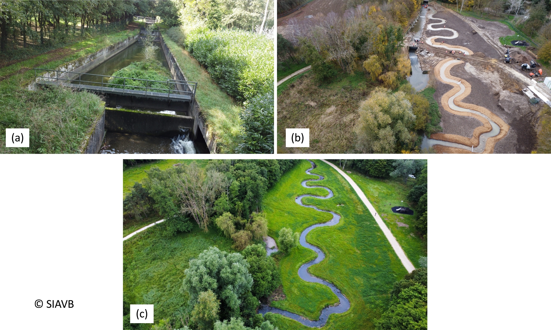 Restauration de la section de la rivière Bièvre Bas prés à Jouy-en-Josas (Yvelines) : (a) avant travaux, (b) pendant travaux et (c) après travaux.