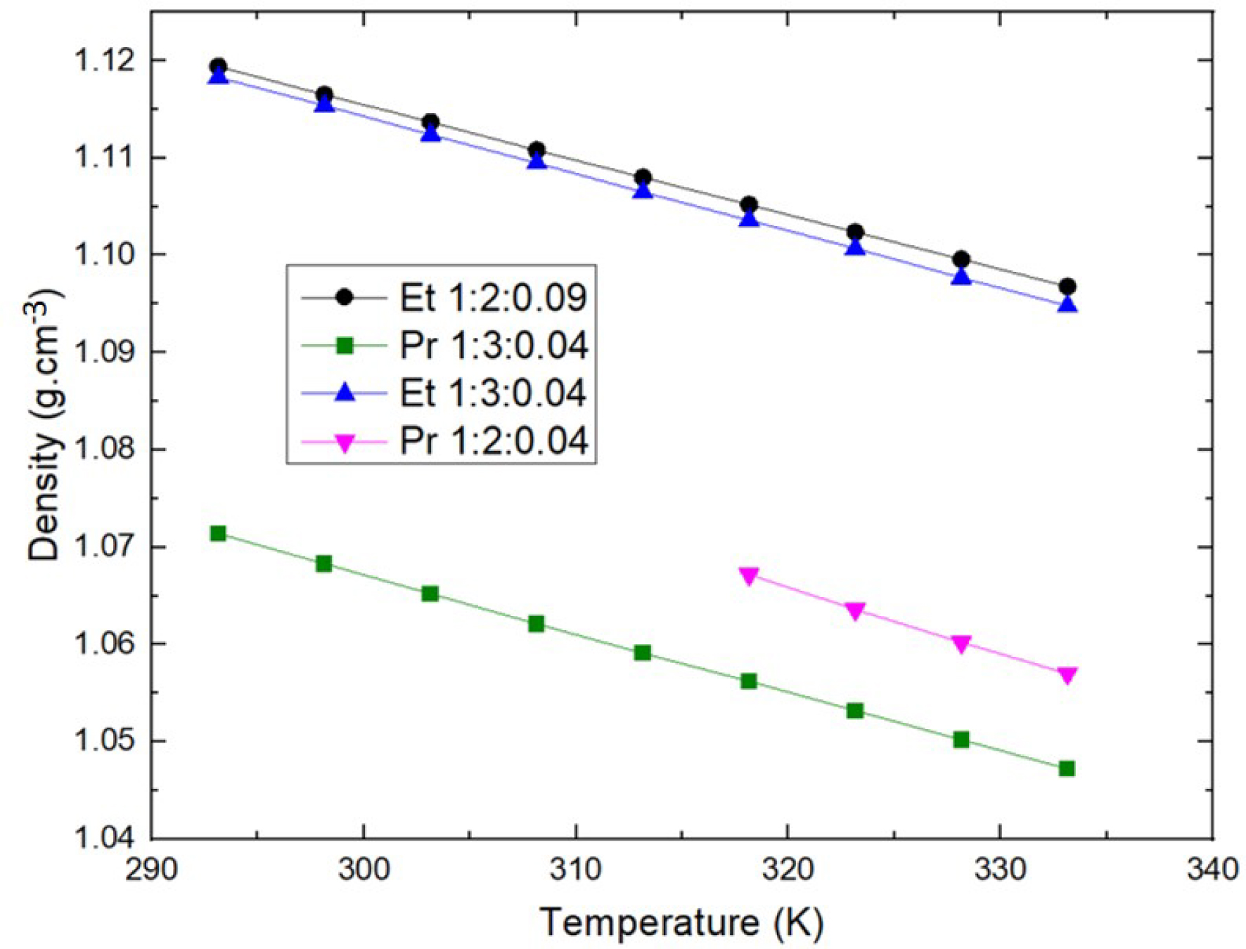 Density comparison of ChCl:EG and ChCl:PG DESs at different HBA:HBD ratios as a function of temperature.