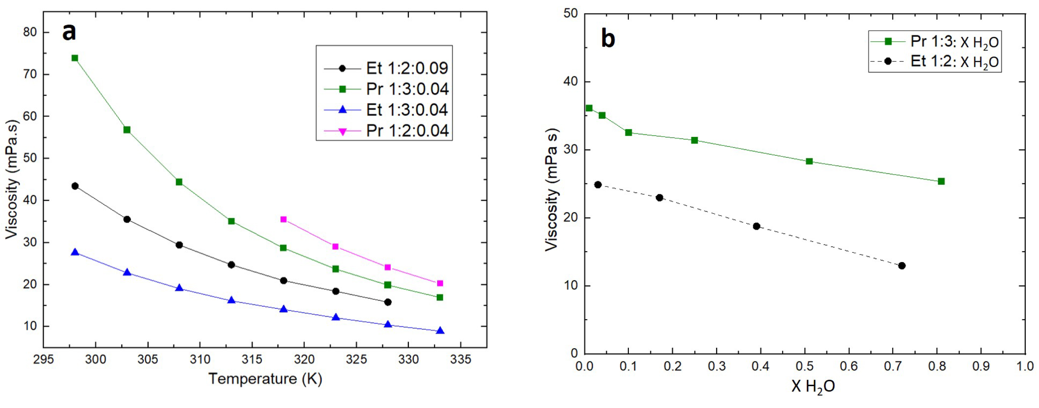 The influence of water content was studied by adding variable amounts of water from 600 to 47,000 ppm, which corresponds to ChCl:PG:H2O molar ratios from 1:3:0.01 to 1:3:0.818. Viscosity measurements of Et 1:2 at similar water contents were added for comparison purpose (Figure 2b).