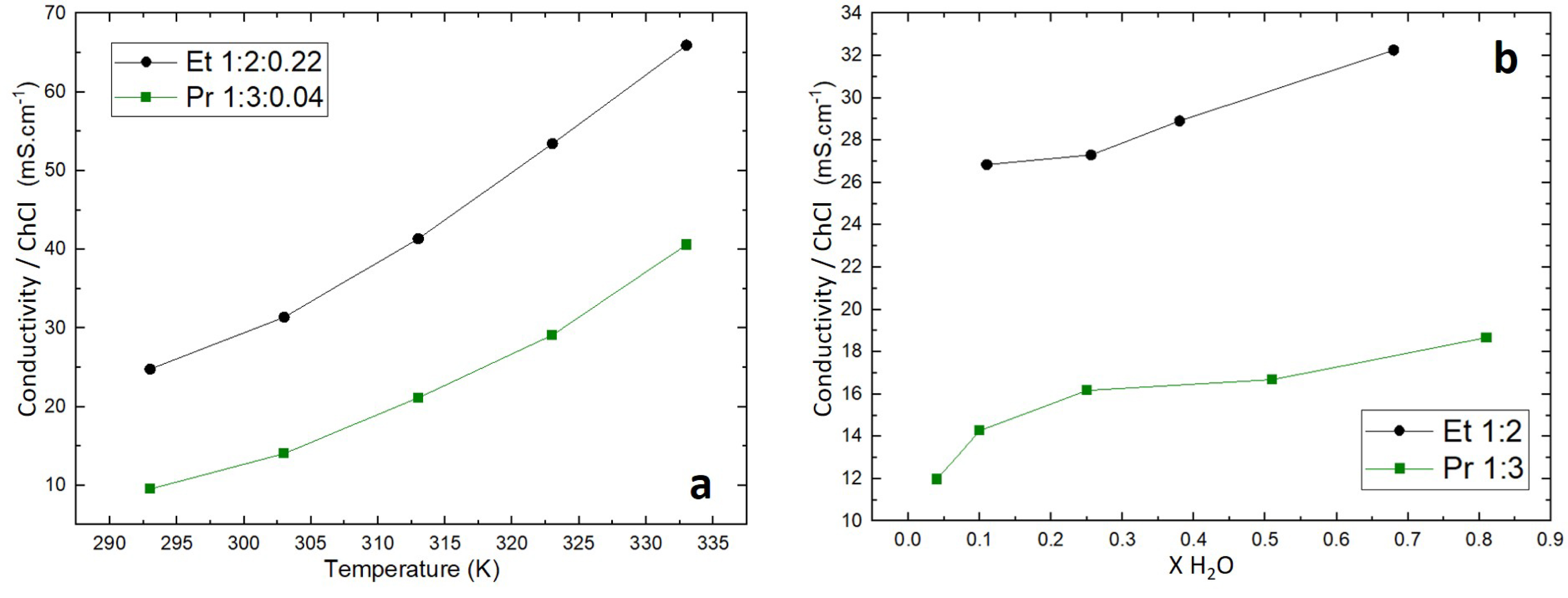 Figures 3a and 3b show the conductivity values of Et 1:2 and Pr 1:3 normalized by the ChCl molar ratio, as a function of temperature and water content, respectively. Ch+ and Cl− being the conductive species of the DESs, this representation allows to free oneself from the difference in ChCl proportion between the two considered DESs.