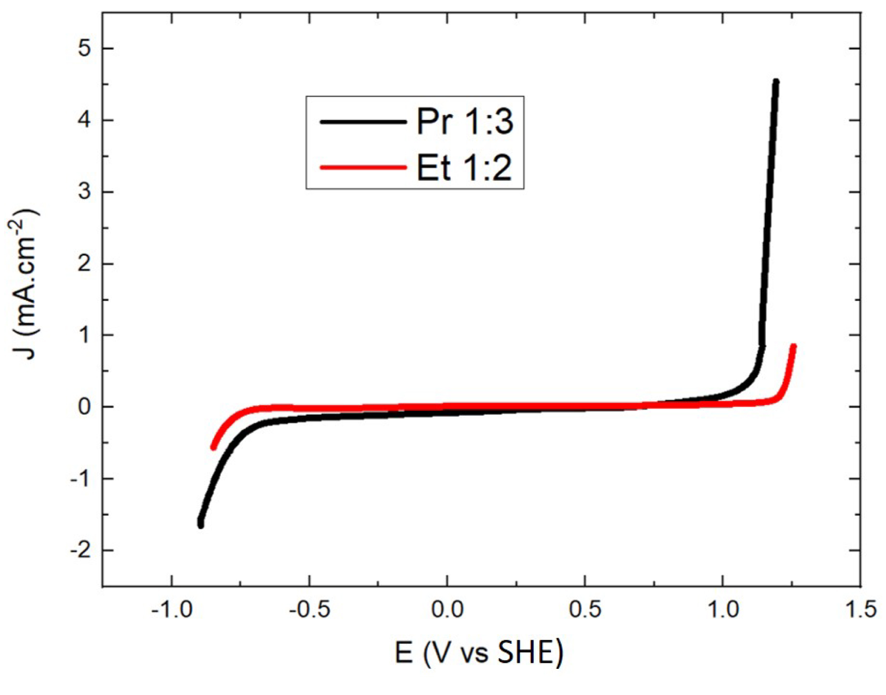 Electrochemical window of Et 1:2 and Pr 1:3 recorded by linear sweep voltammetry on a Pt working electrode at 20 mV⋅s−1 and 313 K.