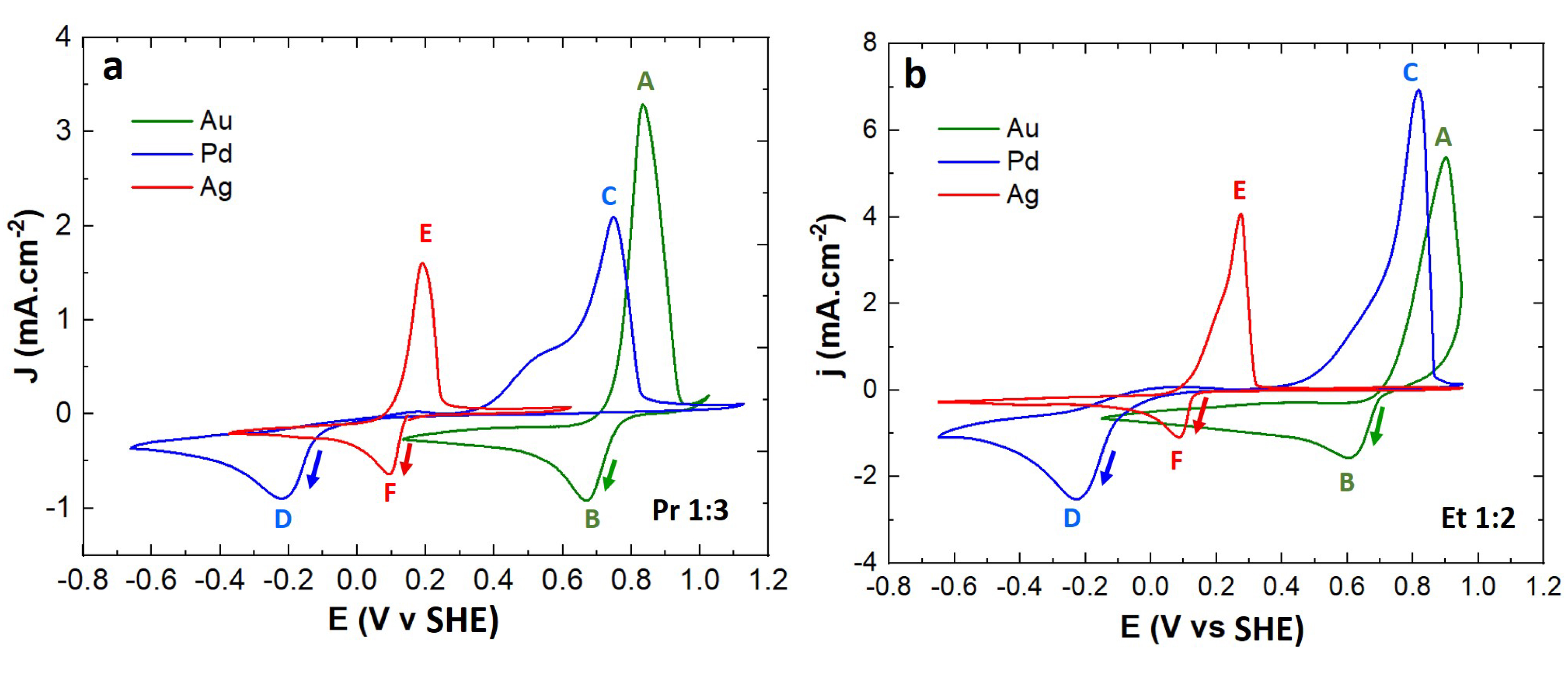 Cyclic voltammograms of Au(I), Pd(II) and Ag(I) monometallic leachates in (a) Pr 1:3 ([Au(I)] = 50 mM, [Ag(I)] = 16 mM, [Pd(II)] = 50 mM) and (b) Et 1:2 (([Au(I)] = 25 mM, [Ag(I)] = 25 mM, [Pd(II)] = 25 mM) recorded on Pt at 313 K at a scan rate of 20 mV⋅s−1.