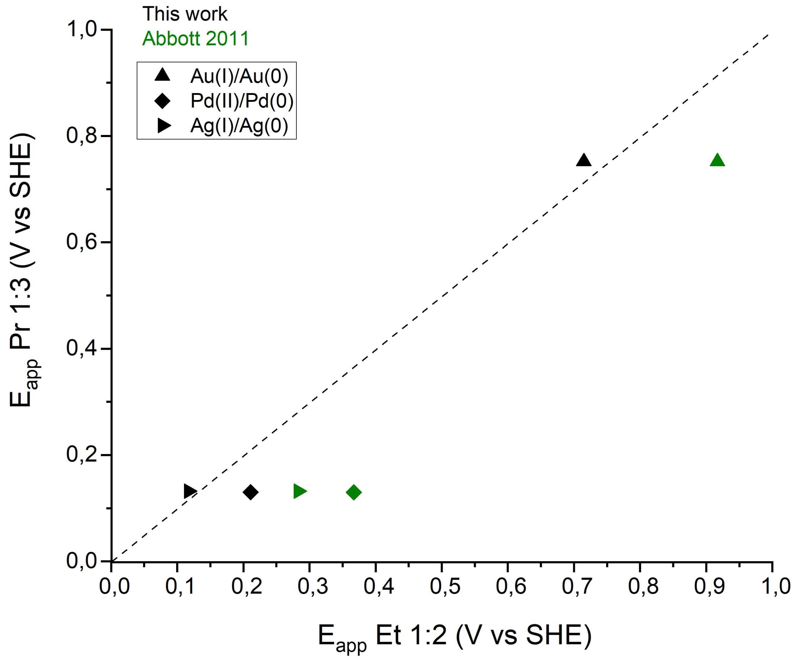 Eapp of Au(I)/Au(0), Pd(II)/Pd(0) and Ag(I)/Ag(0) in Pr 1:3 vs Eapp of Au(I)/Au(0), Pd(II)/Pd(0) and Ag(I)/Ag(0) in Et 1:2. Black labels: this work, green labels: Et1:2 values extracted from Abbott et al.
