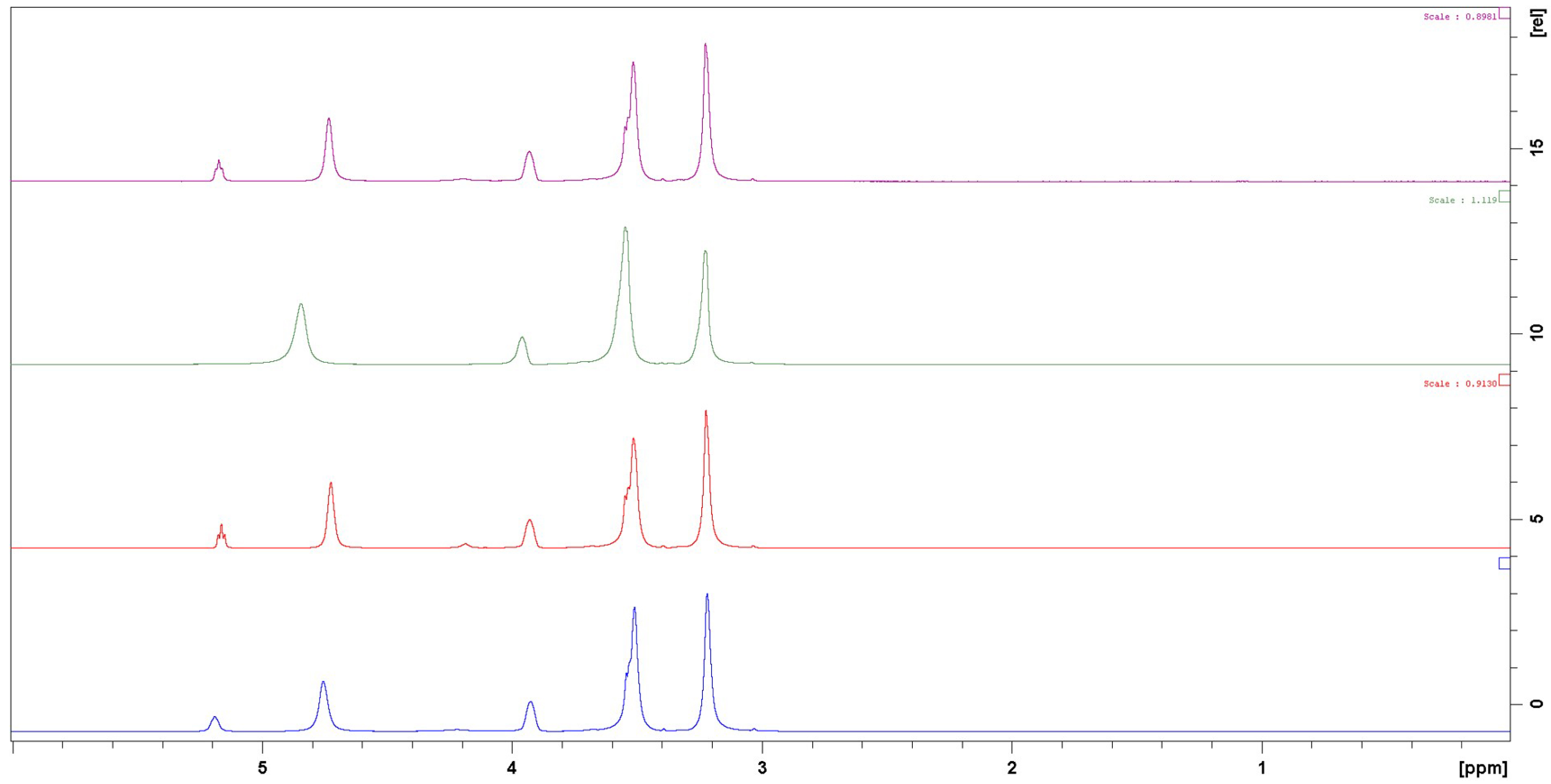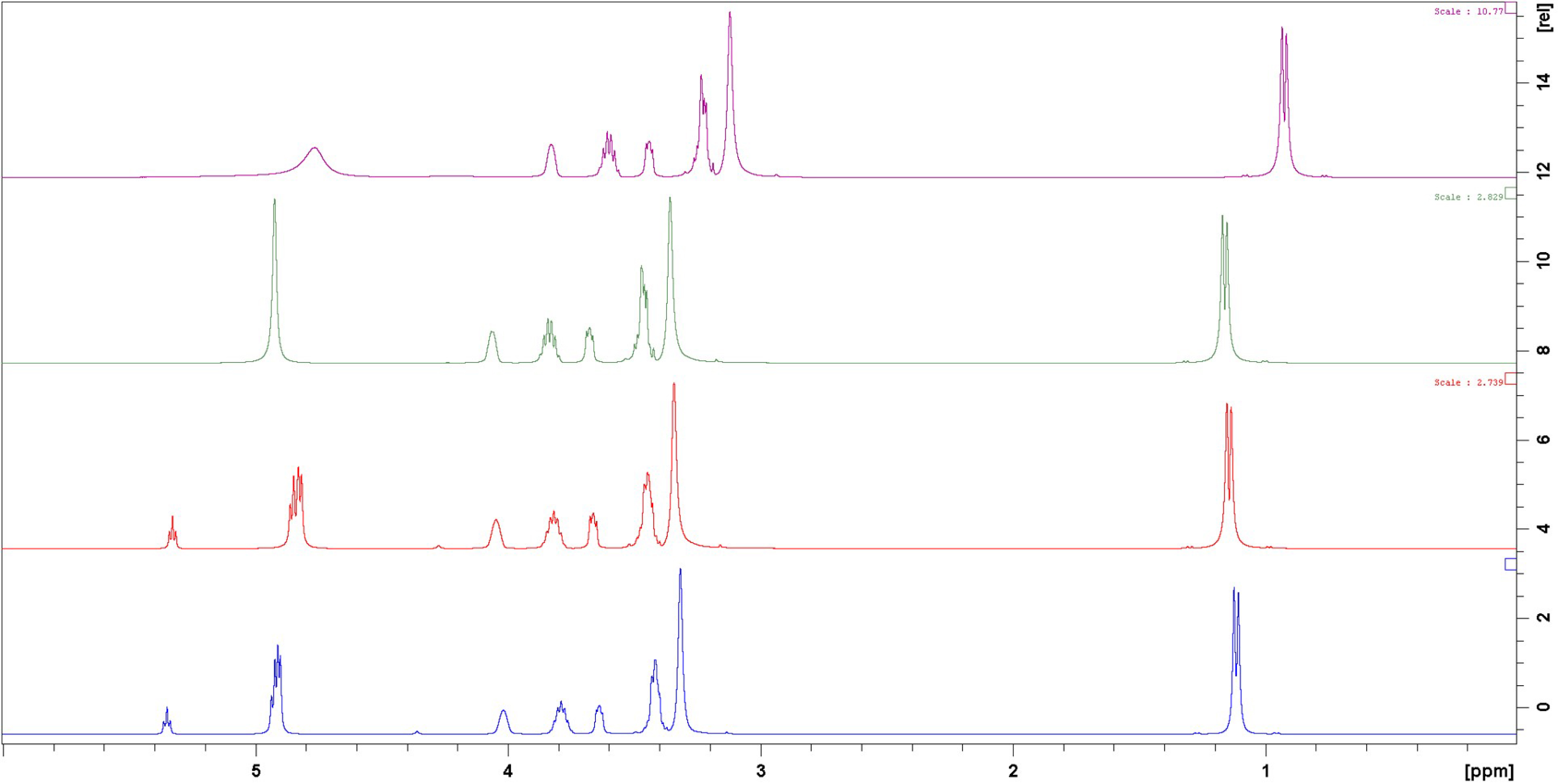 The influence of metallic species was studied by addition of metallic salts (AgCl, PdCl2, AuCl3). Interestingly, upon addition of previously listed metals in Pr 1:3 (Figure 8), it appears that interactions between DESs and metallic species are not systematically the same. In fact, no differences can be seen between Pr 1:3 with and without PdCl2 or AgCl. Nevertheless, in presence of AuCl3, it appears that all labile protons from OH groups are fused (Figure 8, green). The fusion of those signals is explained by a fast exchange of the protons from the hydroxyl groups.