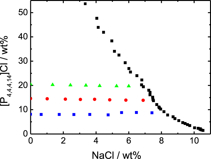 Binodal curve of the system [P4,4,4,14]Cl, NaCl and water, and points investigated by chloride titration. Binodal data (black squares) from [10]. The three series of points correspond to the following IL wt%: 8.12 (blue squares), 14.55 (red circles) and 20.48% (green triangles).