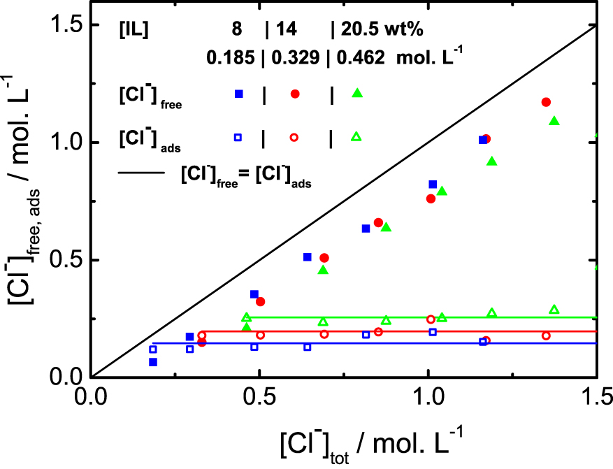 Chloride titration for three different ionic liquid contents, as a function of total amount (in mol⋅L−1) of chloride. The [Cl−]free are directly measured and the [Cl−]ads are deduced from the measurement by the relation [Cl−]tot = [Cl−]ads + [Cl−]free. The line x = y would be the behavior without any adsorption at the micelle surface.
