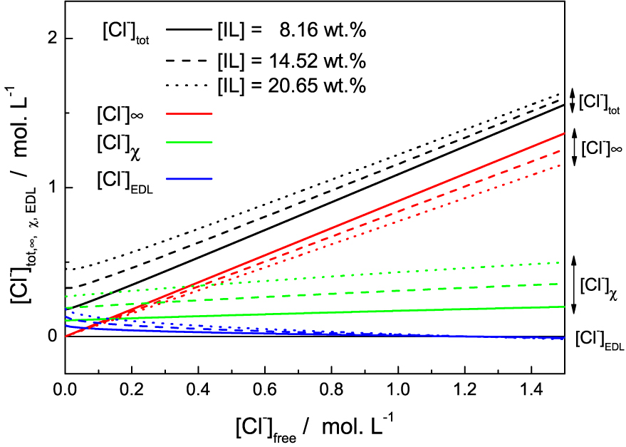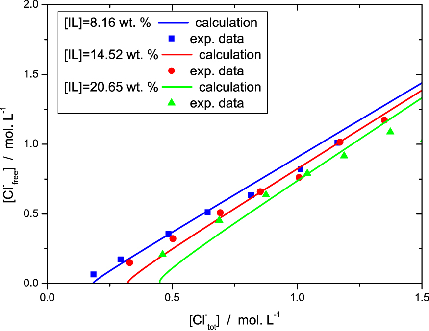In the Figure 3, we inverted the axes in order to stick to the experimental observables. Despite the simplicity of the model we have a quantitative agreement with the data for the range of chloride and ionic liquid concentrations investigated, although some deviations are observed and discussed below.