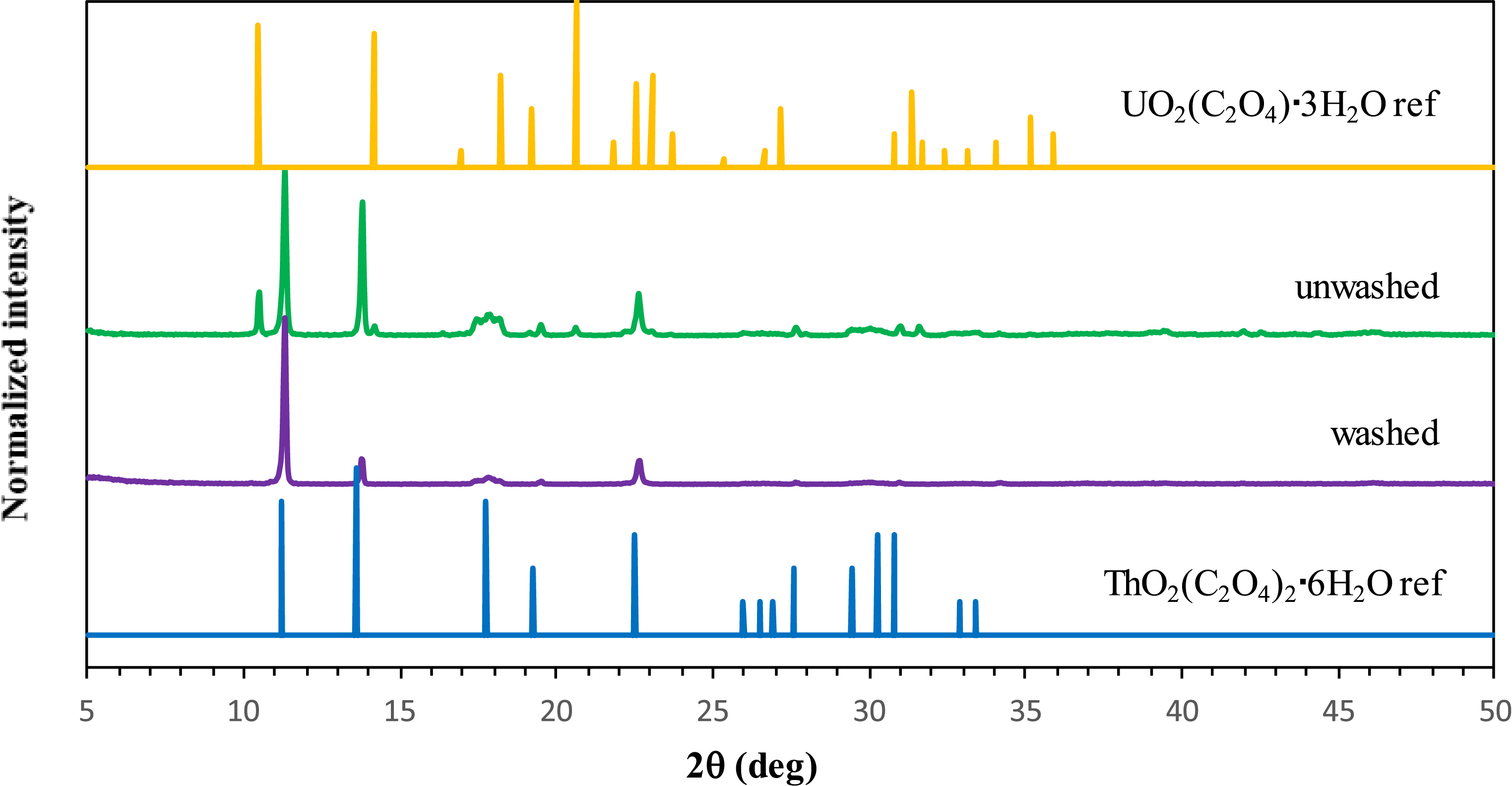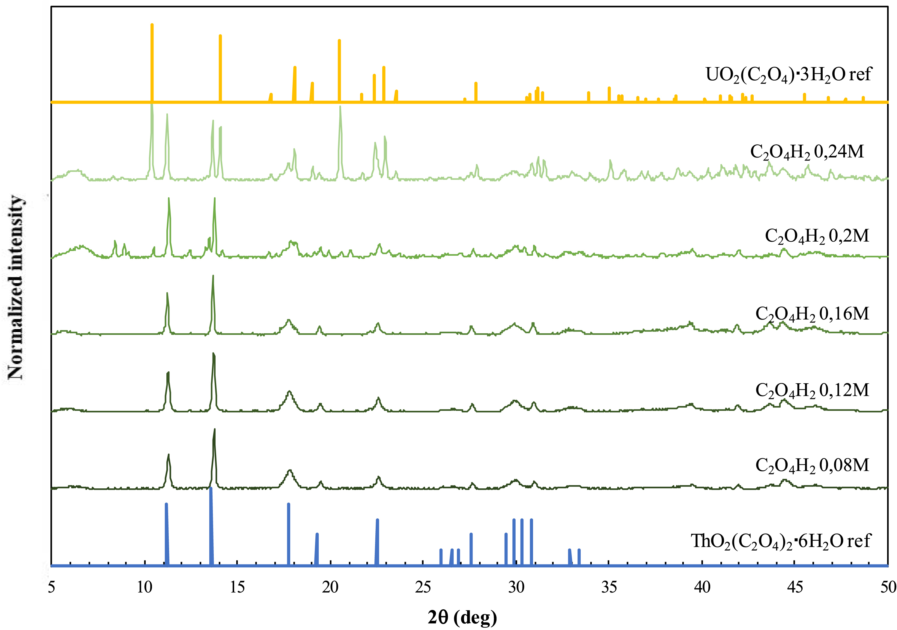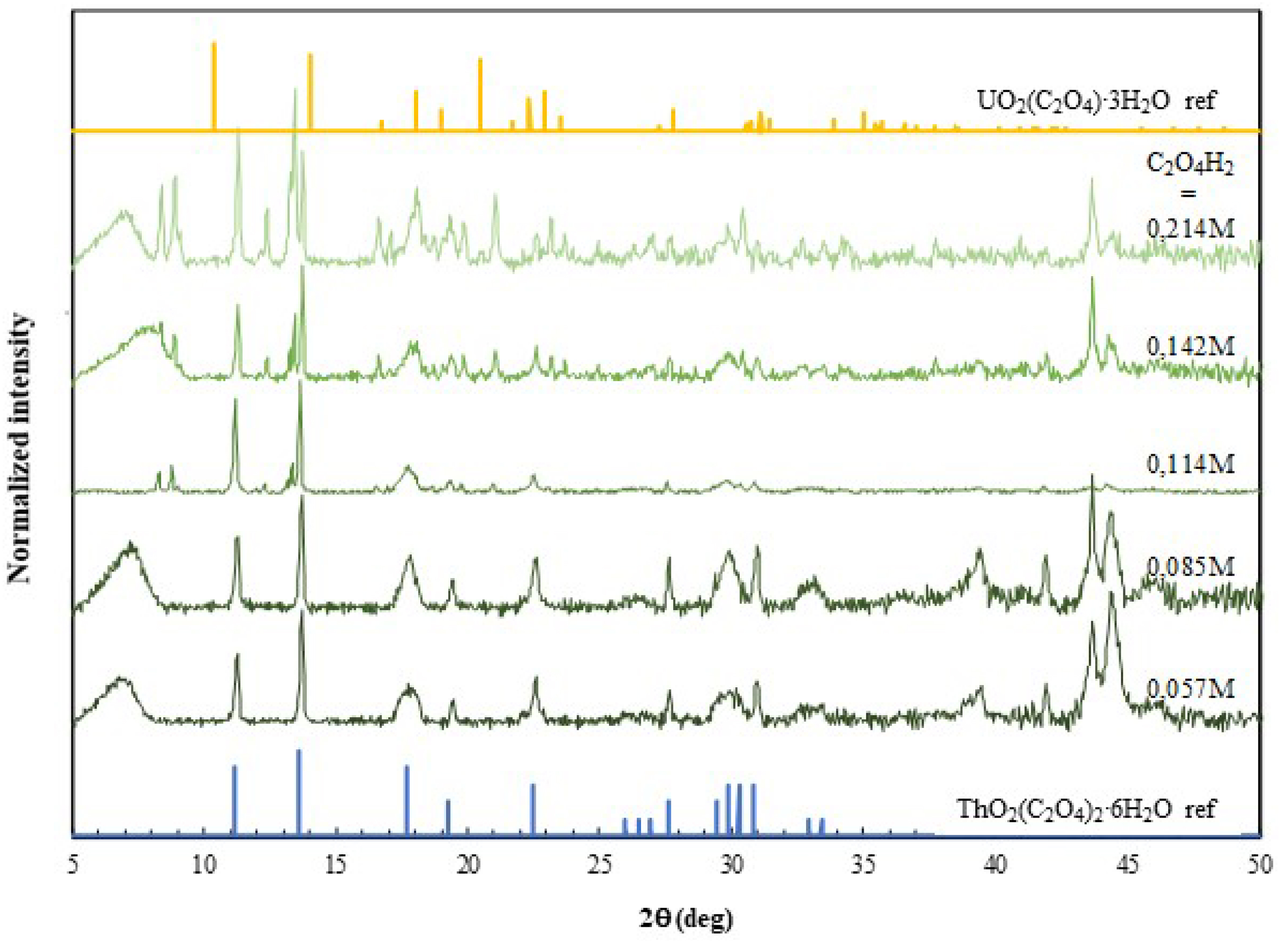PXRD patterns of the precipitates obtained from organic-phase precipitation of uranium and thorium at variable C2O4H2 concentrations and a fixed HNO3 concentration of 0.1 M. Reference diffractograms of UO2(C2O4)⋅3H2O and Th(C2O4)2⋅6H2O correspond to JCPDS No. 01-073-7325 and No. 00-022-1485, respectively.