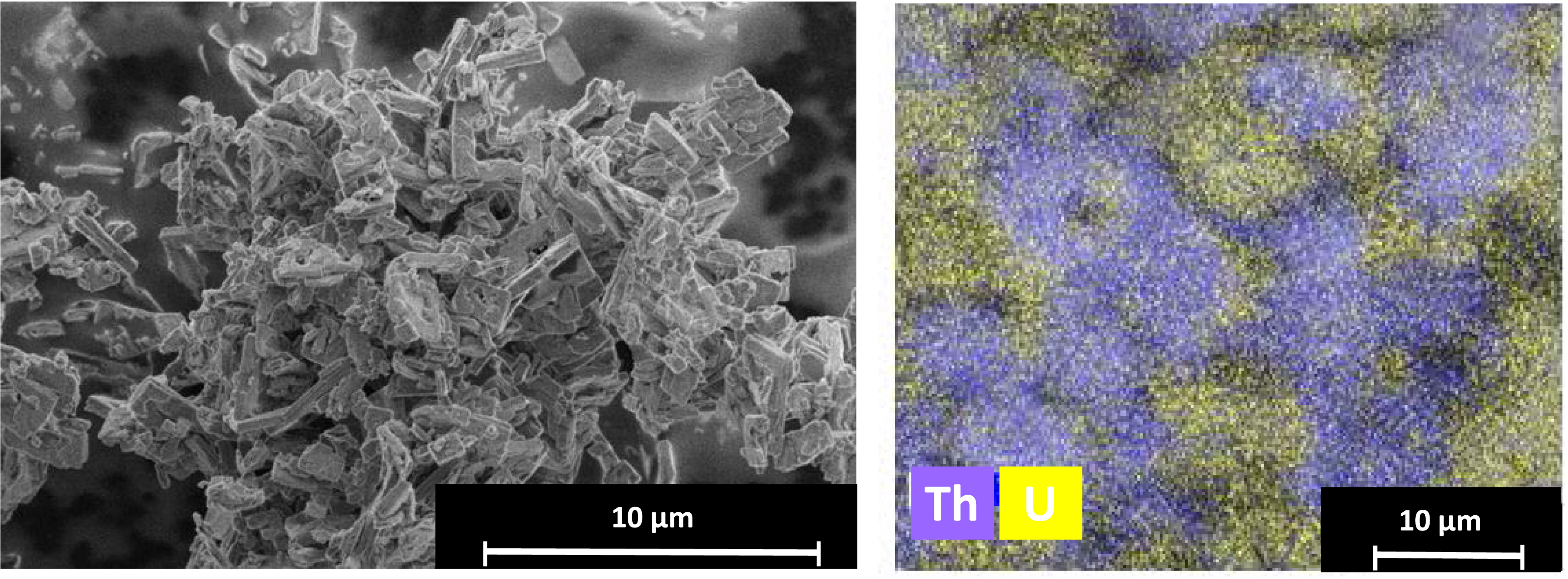 These results suggest that uranium and thorium precipitate separately and do not coprecipitate to form a single material. Based on SEM analyses, the precipitate obtained exhibits a platelet shape (Figure 4). Moreover, EDX analysis reveals that U and Th are not systematically colocalized: some microdomains are Th-rich, whereas some others are U-rich (Figure 4). Altogether, whether the precipitation occurs in organic or aqueous phase, or at the interface, Th(IV) precipitates first as thorium oxalate, followed by U(VI) as uranyl oxalate as soon as acid content of the aqueous phase is sufficient. The U:Th ratio is monitored through either adjustment of the C2O4H2 concentration, or after precipitation via selective leaching of uranyl oxalate.