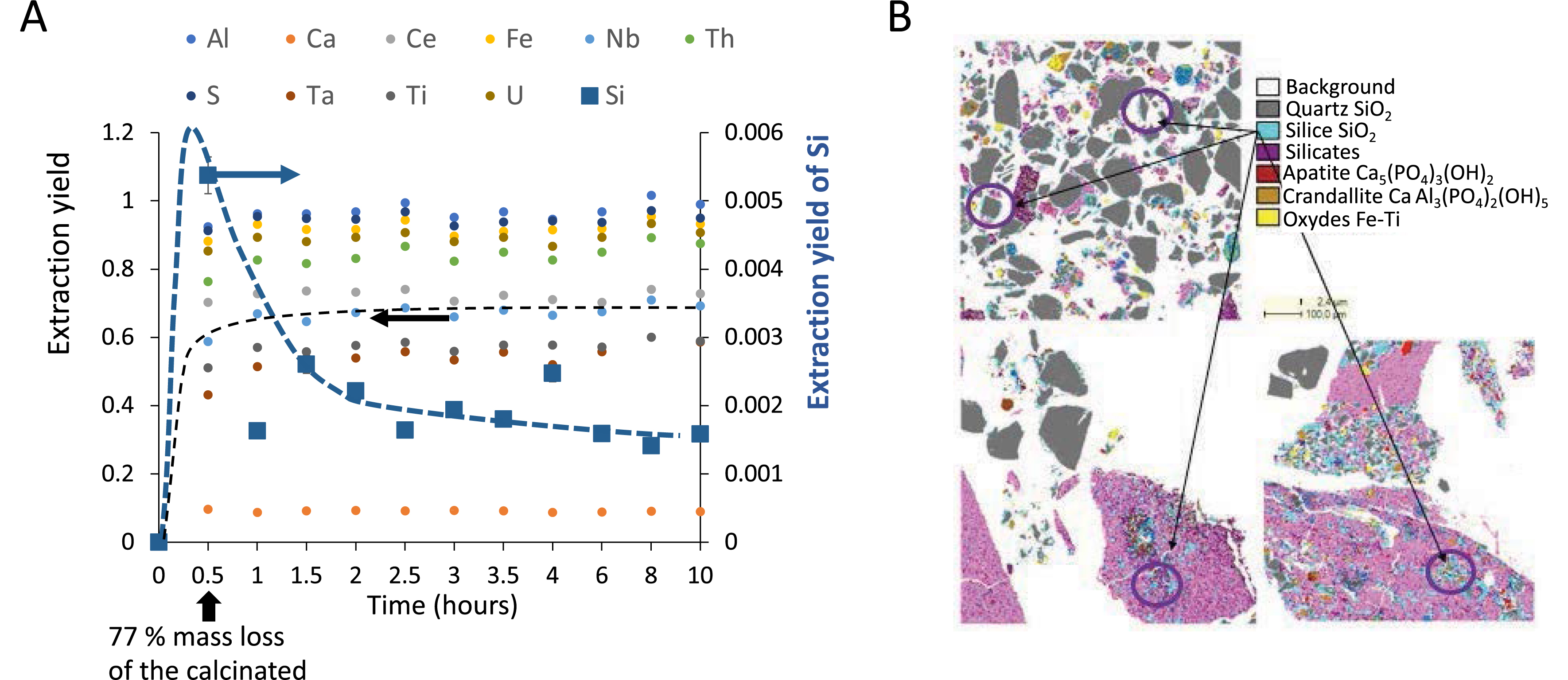 (A) Extraction monitoring of each element in solution over time, quantified by ICP and performed at L/C = 1. Reaching a value of 1 means that the whole amount of the element initially present in the calcinated ore was extracted in solution. All elements reach an asymptotic value of the extraction yield (left Y -axis) within 1 h except silicon, which displays a non-monotonic behavior and much lower extraction yields (right Y -axis). Note that after 30 min, 77% of the calcinated mass is dissolved in solution. (B) QEMSCAN field maps from residue samples collected after 0.5 h (top left), 1.5 h (down left), and 24 h (down right) leaching time. Images are field maps from 1 × 1 mm thin polished sections with false color composite images with different assigned mineral phases shown in the legend panel. Quartz and silica are two phases that are difficult to distinguish, but SiO2 is identified on pixels for which the Si content is lower than that expected for quartz. These pixels are found either at the edge of quartz grains (map 0.5 h) or in small isolated grains in the sulfate matrix (anhydrite).