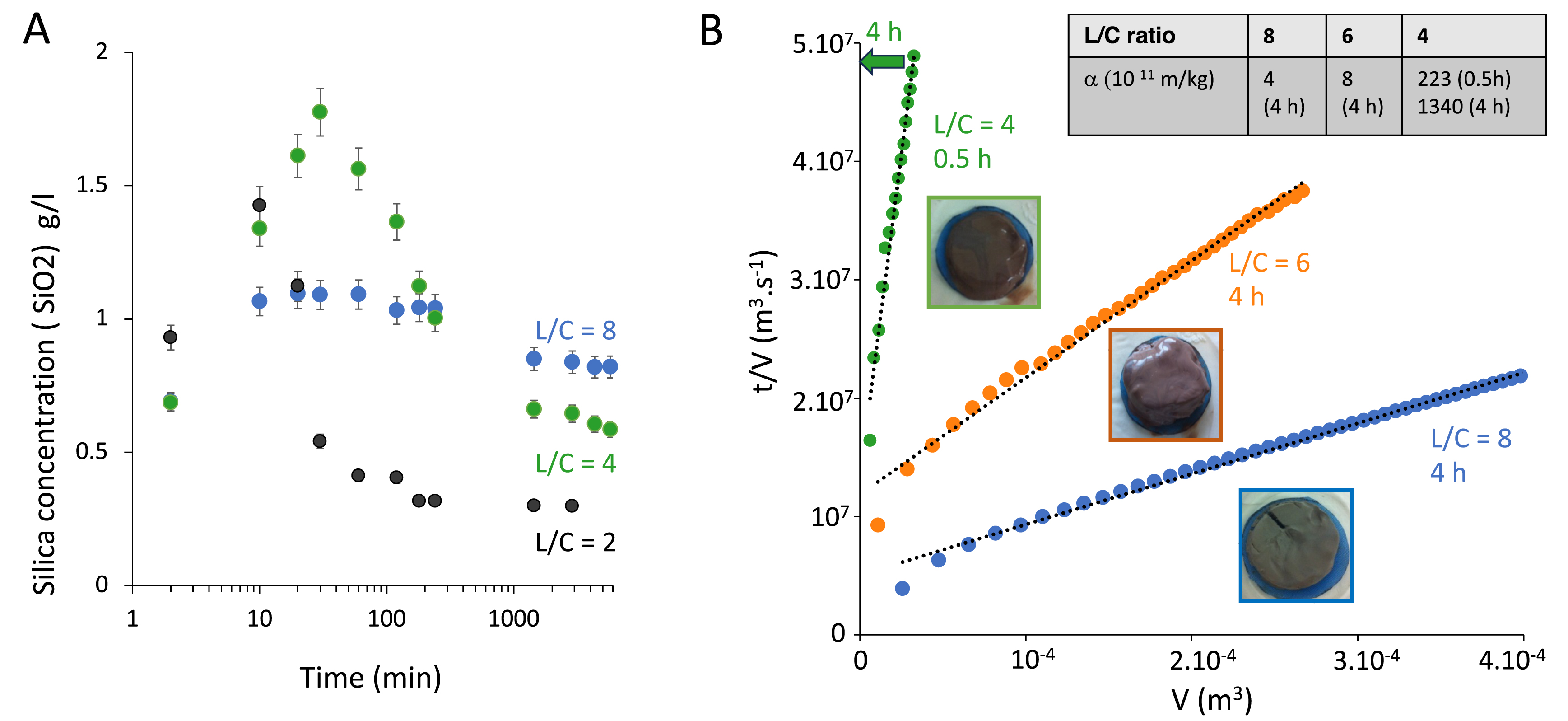 (A) Kinetics of silicon leaching and precipitation for three liquid-to-calcinated ratios L/C. The silica concentration is determined by the molybdenum blue assay in the supernatant of the leached slurry. Initially, silicon is extracted from dissolving mineral phases in solution and eventually precipitates as silica, which explains the non-monotonic variation of the silicon concentration in solution over time. The larger the L/C ratio, the smaller the extent of precipitation. (B) Filtration kinetics for slurries obtained after 0.5 h or 4 h of leaching for three L/C ratios. The linear variation of t/V with V allows us to calculate the specific resistance to filtration, 𝛼 (kg/m3), according to Equation (1). The higher the resistance, the less filterable the slurry.