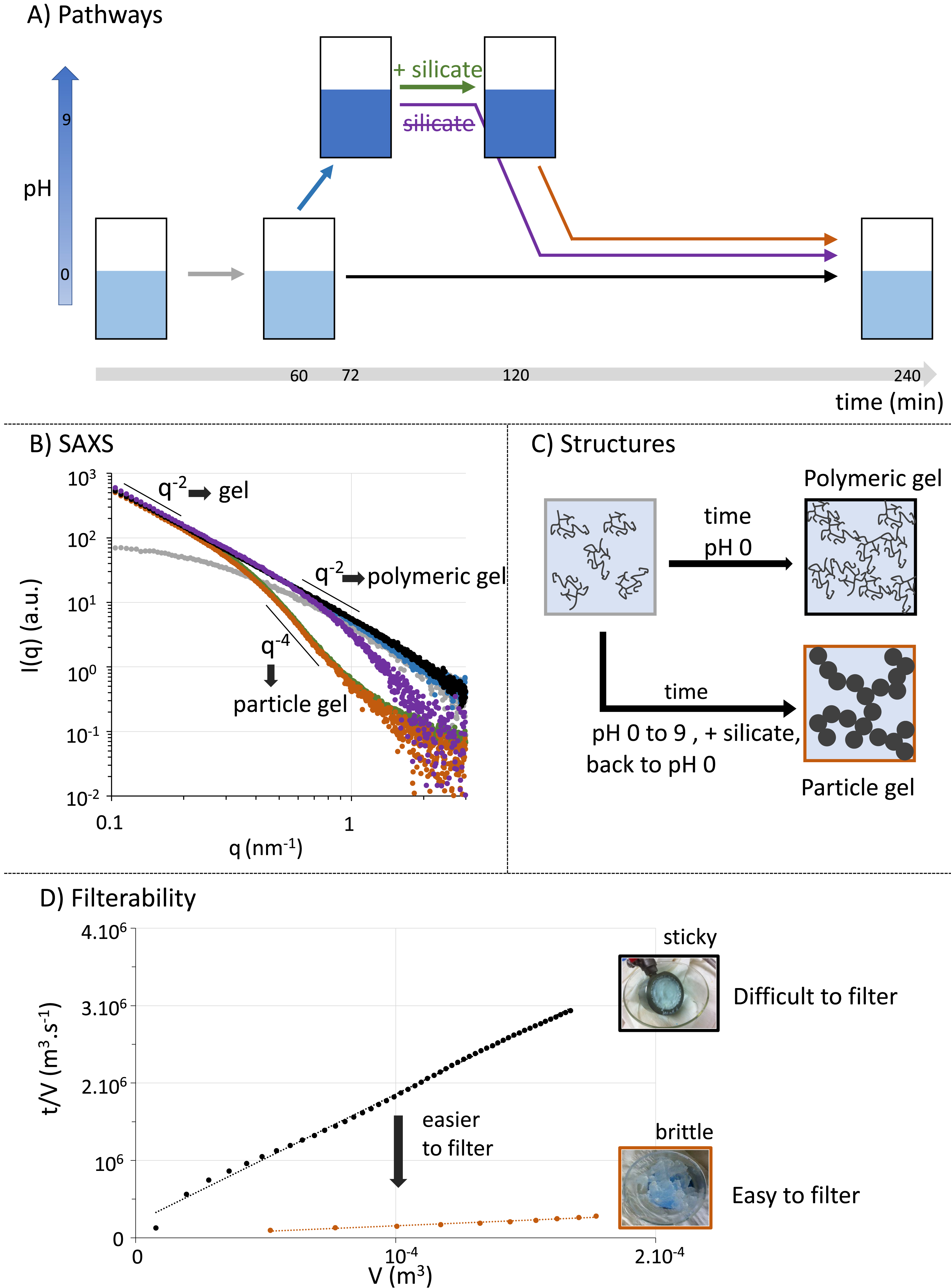 (A) Different silica precipitation paths in a hydrometallurgical process. The conventional method is to remain at pH 0. The alternative methods tested are to increase pH to 9 and then add or not silicates, before switching back to pH 0. Note that each step is associated with a color code throughout the figure. (B) After each step, a SAXS spectrum is acquired. Over time, a network forms in solution as visualized by the increase in small wave vector intensity q, which eventually leads to a structure factor decaying as q−2 (grey to black curves). The extension of this slope down to larger wave vectors and thus smaller distances indicates that the whole structure can be seen as a polymeric silica gel. Increasing pH to 9 does not change this structure (blue curve). However, adding silicate leads to the compaction of the mesostructure at small distances, and the Porod law in q−4 is recovered (green curve). This structure is maintained when switching back pH to 0 (orange curve). In contrast, when only the pH cycle is performed without adding silicates, the structure changes only to a smaller extent (purple curve). Note that scattering intensities are not on an absolute scale as the sampling is not achievable at a controlled silica concentration. They were thus scaled by arbitrary factors to highlight similarities and differences. (C) Schemes of the mesostructures obtained depending on the pH cycle used. (D) Filterability of the two different gels obtained (pH = 0 or pH cycle and silicate addition). The sticky gel obtained at pH 0 is strongly clogging while the brittle gel obtained through the pH cycle and silicate addition is much easier to filter. Small length scales thus dictate the filterability, and compacting them is a profitable process modification.