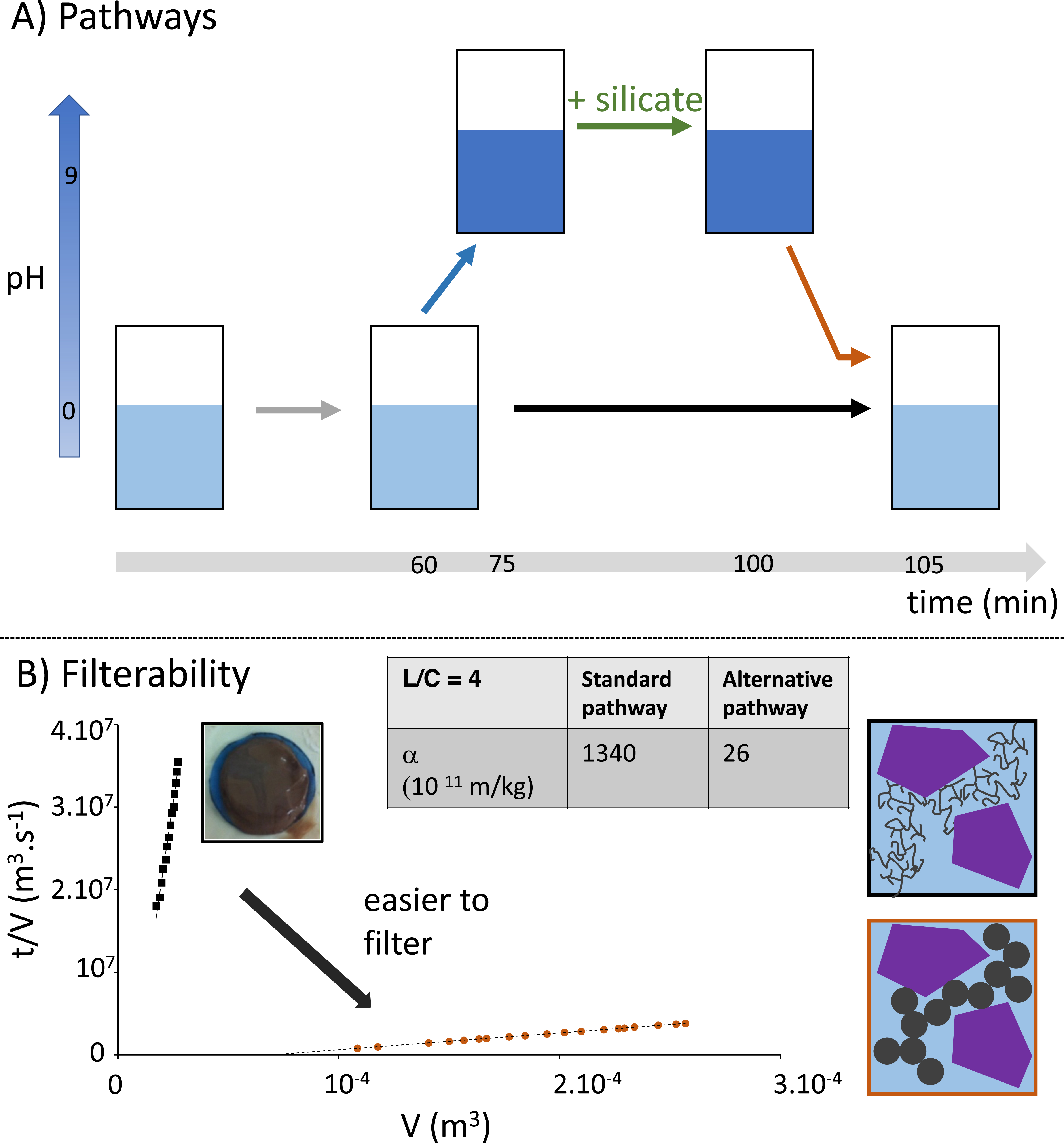 (A) Conventional and alternative precipitation pathways performed on the real ore. In the alternative pathway, silicates are added at basic pH before shifting back the pH to high acidic values. (B) Resulting filterability profiles for both gels were obtained throughout the two pathways. The strong collapse of the specific resistance when performing the silicate addition at the basic pH pathway indicates a tremendous improvement in the filterability. Note that the final liquid/solid ratio is 4. The scheme proposed is the same as in Figure 3 but includes insoluble mineral grains (purple) in addition to the forming silica networks.