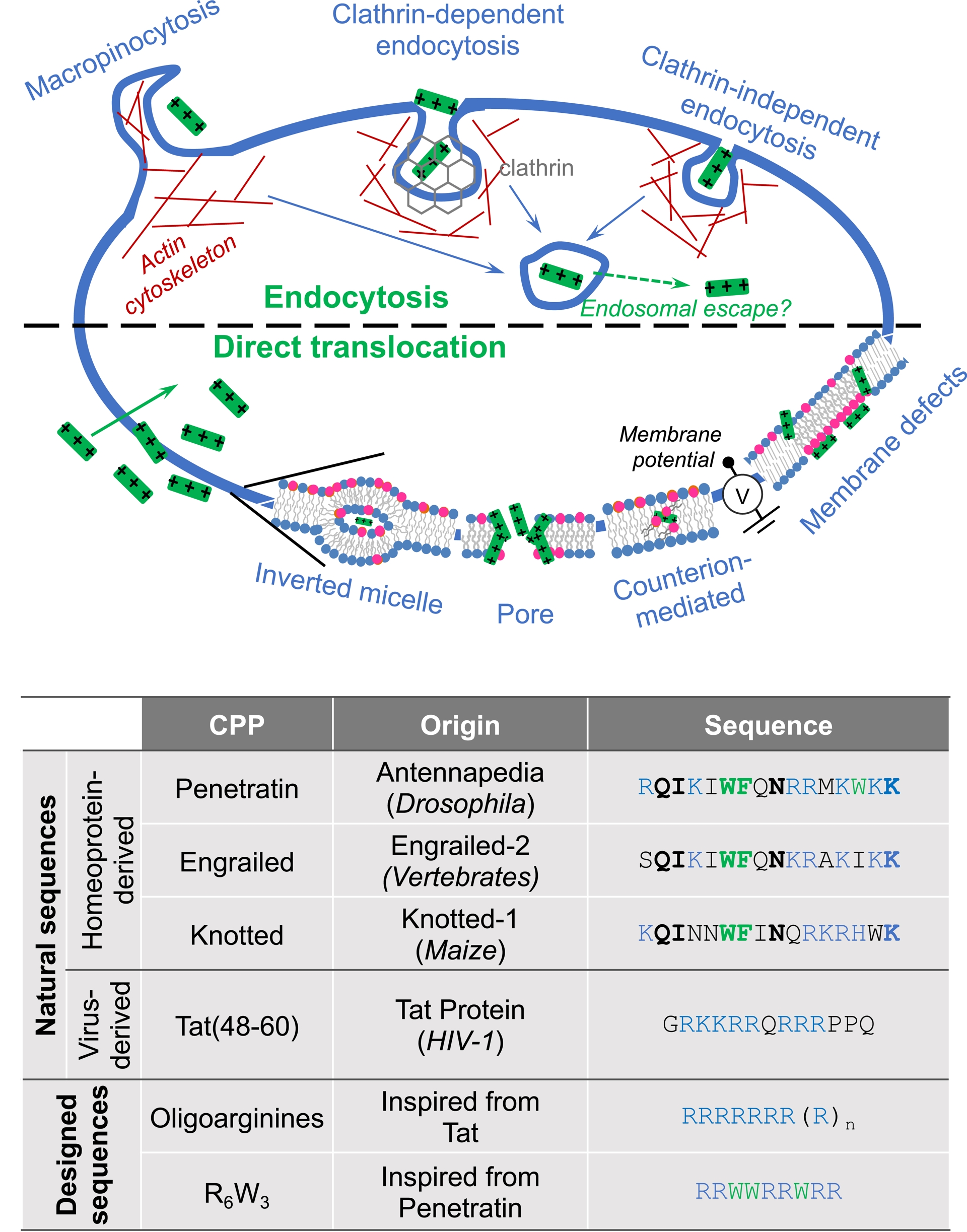 For years, many research groups working on the mechanism of internalization of CPPs, using multidisciplinary approaches (chemistry, biophysics, biochemistry, and biology), have contradicted each other article after article. Indeed, over the past 30 years, most publications have indicated that the route of entry of these peptides into cells is an endocytosis mechanism, implying that the peptides are able to exit endosomal vesicles so that the transported cargoes can exert the observed biological activity. Other studies, on the other hand, refer to an original mechanism known as translocation that can be assimilated as direct passage of the plasma membrane, even if it appears thermodynamically impossible for a heavily charged peptide to cross the hydrophobic core of the lipid bilayer. The controversy also mainly arose from the complexity and difficulties to observe translocation compared to endocytosis in living cells. Currently, it is quite accepted that the two main internalization processes, endocytosis and translocation (Figure 1), can coexist for one peptide used at one concentration [12, 13, 14], which makes the study of one pathway versus the other even more complicated. Various studies reporting translocation rely on model membrane systems that are less complex than living cells but allow observing peptides crossing a lipid bilayer without the requirement of an energy input. It is also possible to quantify a peptide entry through translocation by working with cells kept at low temperature (<12 °C), where all energy-dependent processes are inhibited. However, one should keep in mind that working with cells at low temperature not only inhibits endocytosis paths but can also affect membrane dynamics and fluidity since temperature modifies the phase behavior of lipids. Altogether, this translocation mechanism cannot be equated with passive diffusion in its admitted definition.