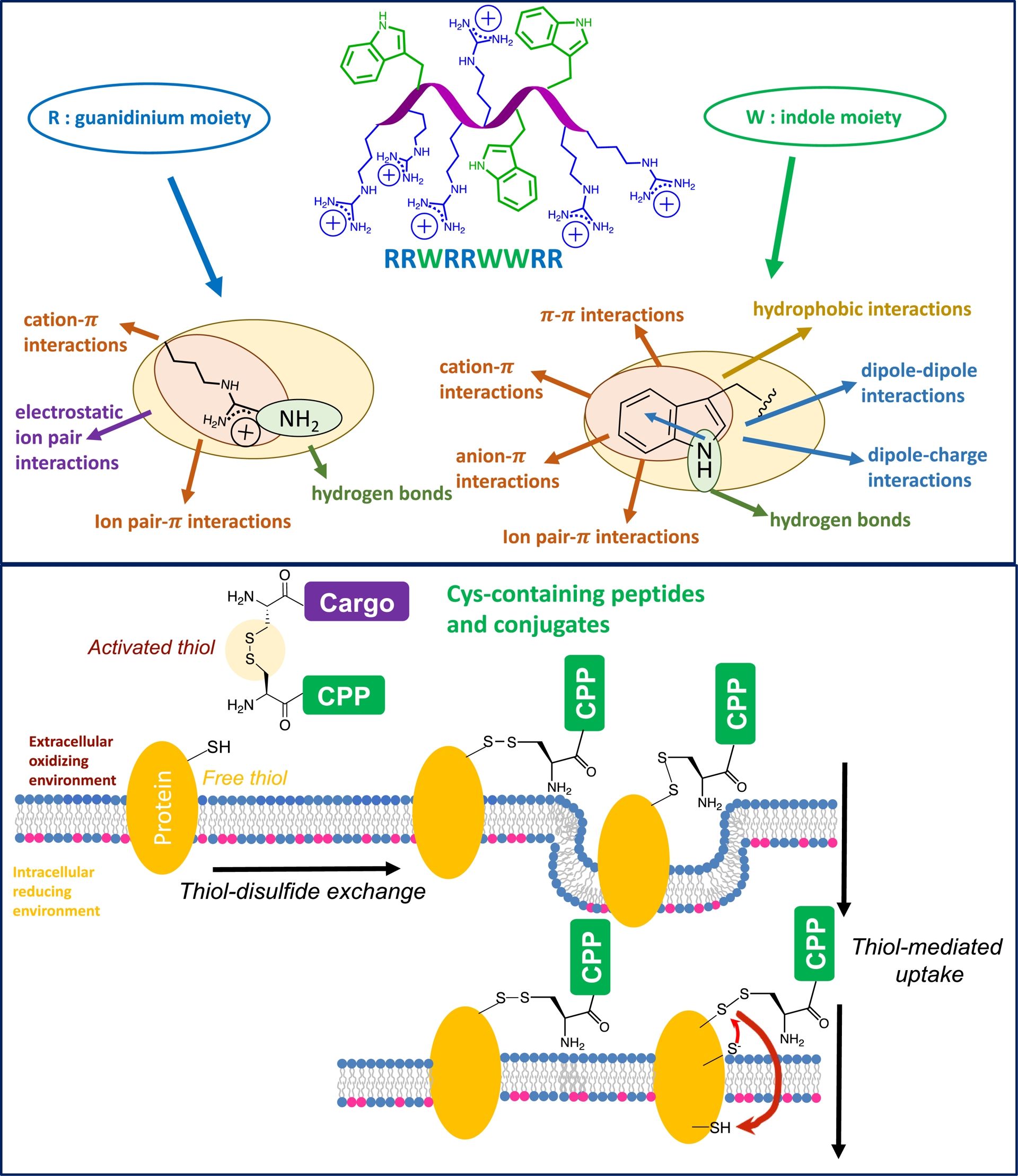 In addition to the development of reliable quantification methods, the work of our group focuses on the molecular understanding of uptake mechanisms, one aspect of which is studying the precise role of some amino acids in CPP sequences. As already described as the magic arginine and tryptophan power [36], these two amino acids are crucial to cell penetration thanks to the unique non-covalent bonds they can establish, which we detail (vide infra). Other amino acids such as cysteine can significantly impact internalization, in particular through disulfide cross-exchange with thiol-containing cell membrane proteins [37, 38].