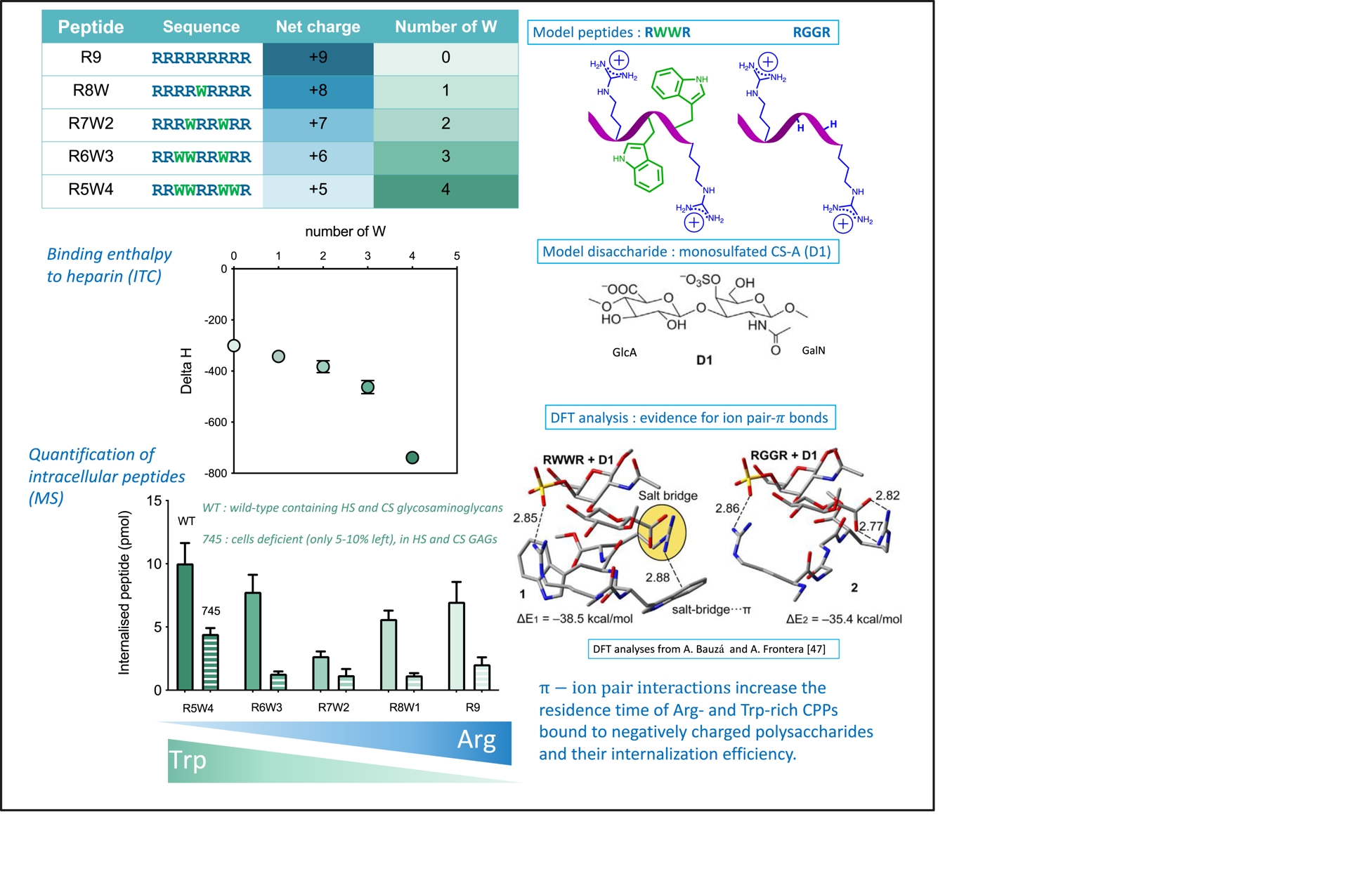 We reported that Trp-containing CPPs have enhanced internalization efficacy compared with analogues that do not contain this unique amino acid [44, 45, 46]. We have recently added a new type of interaction to the already long list of interactions that the indole group of Trp can establish: π–ion pairs [47, 43]. We used a series of nona-peptides composed only of Trp (from 0 to 5) and Arg (from 9 to 4), which we compared to a series of oligo-arginines (5 to 9), for their capacity to internalize (Figure 3). Results of the quantification of the internalization efficacy of the peptides indicate that R8 and R8W internalize with the same efficacy in cells [47]. So do R7 and R7W2, but R6W3 and R5W4 are better internalized in cells, respectively, than R6 and R5 and even than R9. These results indicate that Trp can advantageously replace Arg to maintain or enhance internalization efficacy. In addition, the number of Trp essentially impacts internalization only in cells expressing negatively charged glycosaminoglycans (GAGs), showing the importance of these cell-surface molecules for the internalization process. In parallel, we could show by isothermal calorimetry (ITC), to analyze the thermodynamics of peptide/heparin, a favorable enthalpy in the formation of the complexes. This enthalpy is balanced by an unfavorable entropy resulting from the loss of flexibility of the peptides bound to heparin, overtaking the favorable counter-ion release. Increasing the number of Trp leads to enhanced favorable binding enthalpies. To explain these results, a DFT analysis by Bauzá and Frontera highlights the crucial role of π–ion pairs involving sulfates from glycosaminoglycans and Arg and Trp in the peptide sequence, which contribute to the binding enthalpy of the peptides to heparin [47]. Formation of heparin/peptide complexes is thus more stable in the presence of ion pair–π interactions (Figure 3).