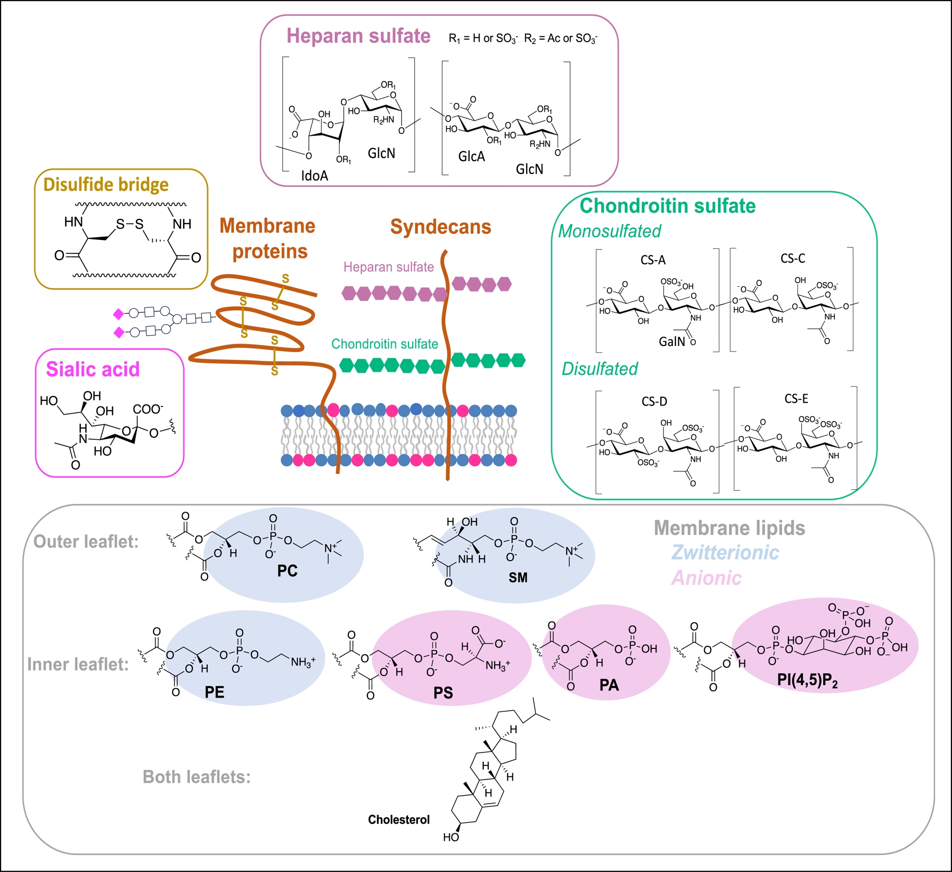 The different types of molecules (heparan and chondroitin sulfate glycosaminoglycans, sialic acids, cysteine-containing proteins, lipid polar heads) that interact with CPPs in the plasma membrane.