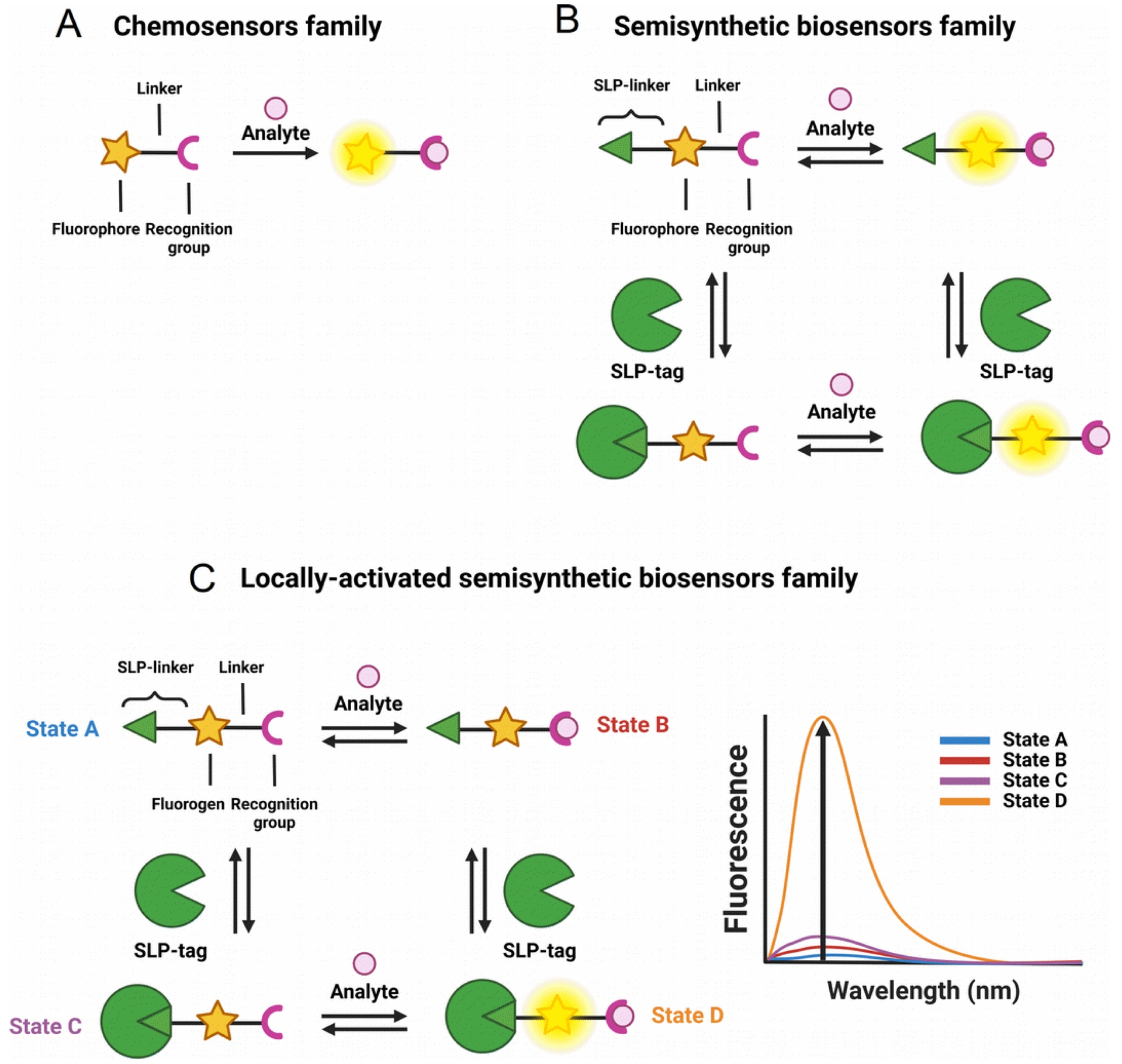 General principle of the different classes of sensors for bioimaging: (A) chemosensors, (B) semisynthetic biosensors, and (C) locally activated semisynthetic biosensors.