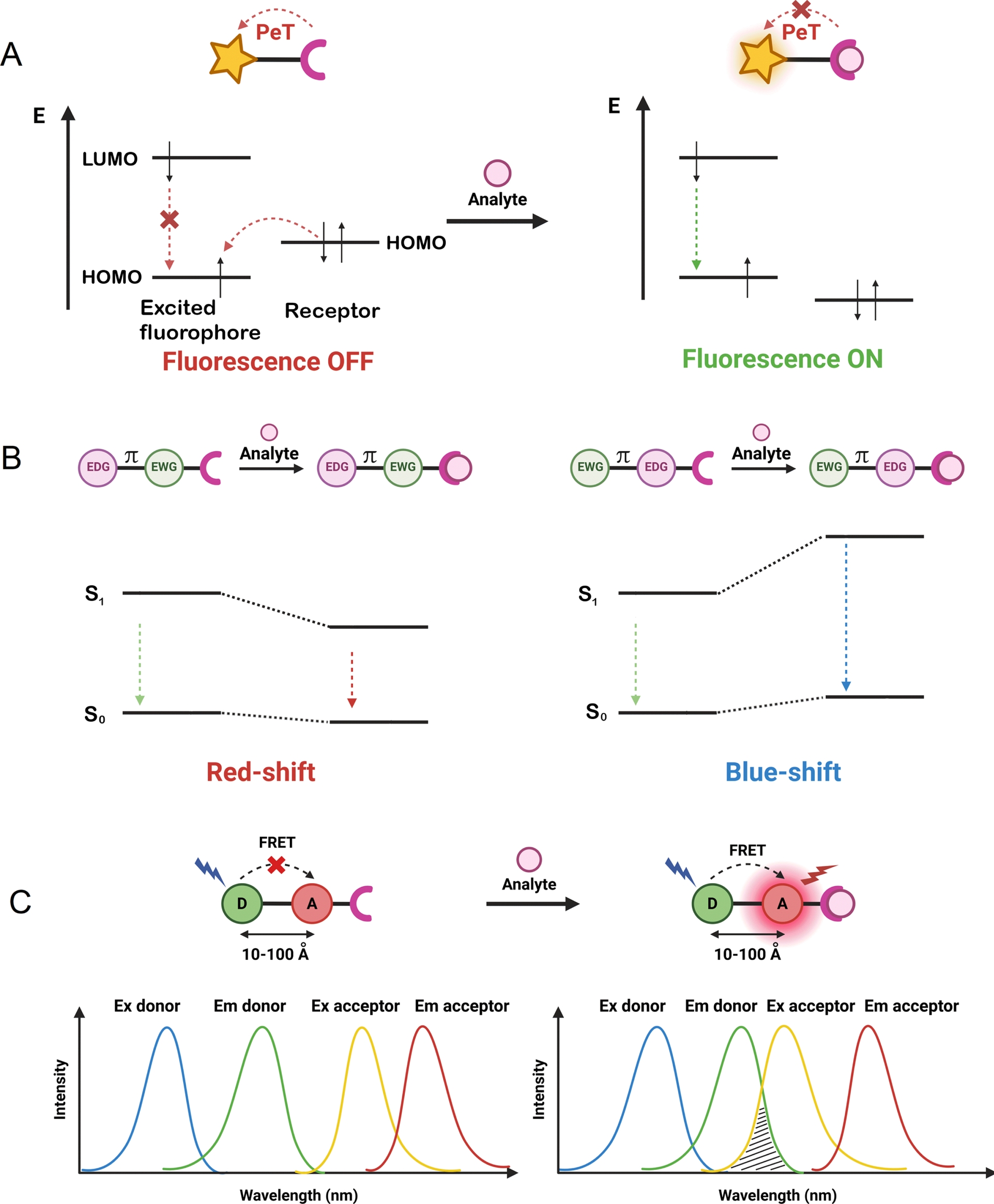 Schematic illustration of the principle of (A) photo-induced electron transfer (PeT), (B) intramolecular charge transfer (ICT; EWG: electron-withdrawing group, EDG: electron-donating group separated by a π-conjugated linker), and (C) FRET (D: FRET donor, A: FRET acceptor) detection mechanisms used in the design of chemosensors.