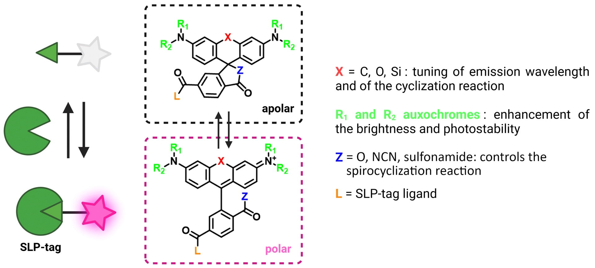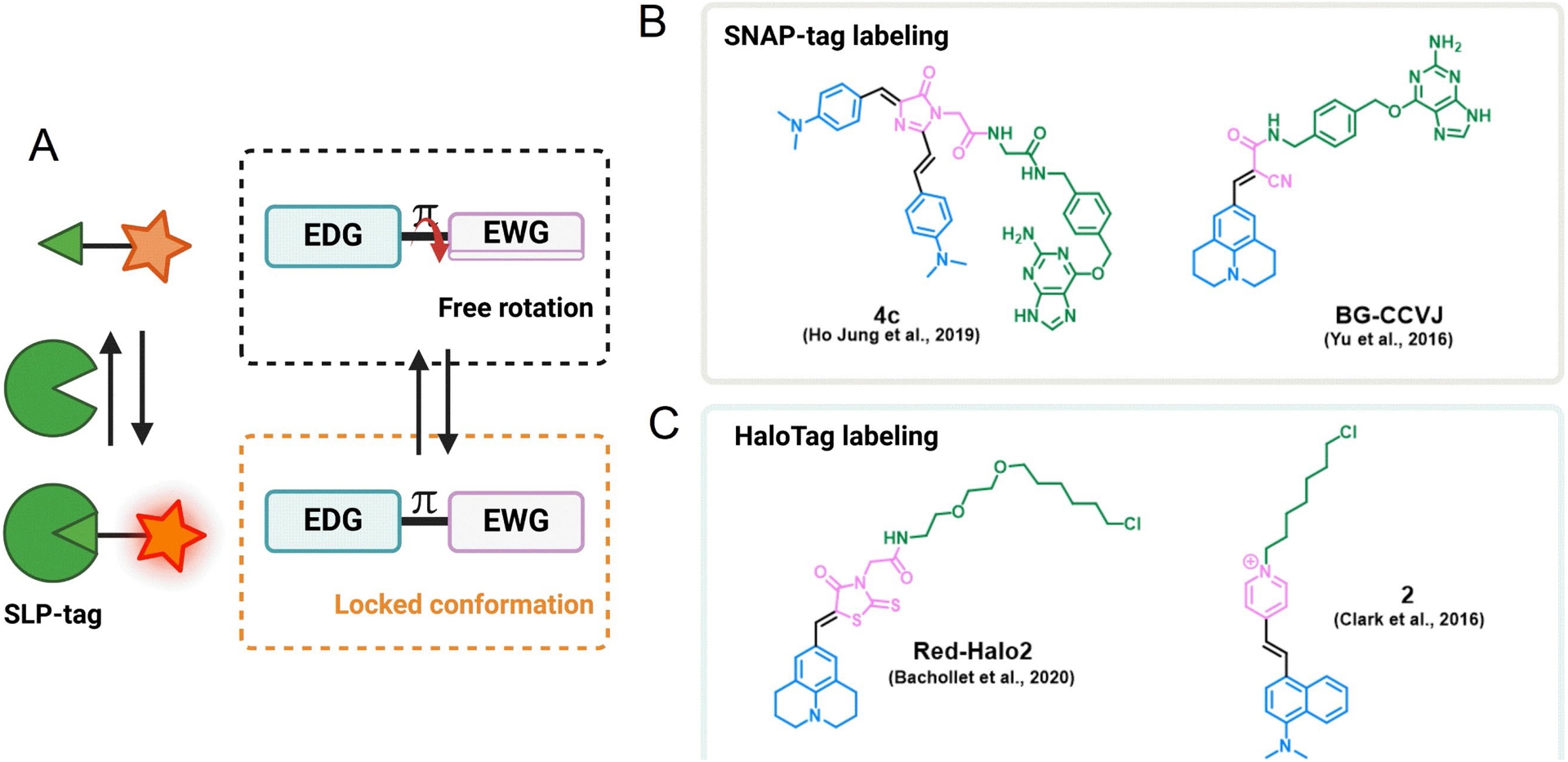 (A) Principle of fluorescence activation mechanism of FMR-based semisynthetic probes upon SLP binding. An EDG is π-conjugated to an EWG. Examples of some FMRs for (B) SNAP-tag labeling and (C) HaloTag labeling.