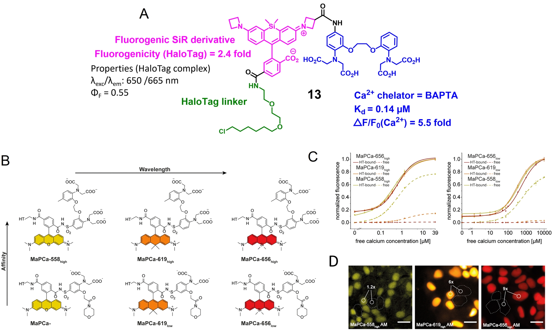 A few years later, the Johnsson group developed another series of locally activated fluorescent semisynthetic calcium indicators called “MaPCa indicators” with good fluorogenicity and tunable emission wavelength and affinity (KD from 0.41 to 457 μM) (Figure 5B) [59]. MaPCa-656high (𝜆exc = 656 nm) was identified as the best candidate with the highest fluorogenicity in the presence of calcium (6-fold increase) and HaloTag (120-fold increase) and the highest contrast in wash-free live-cell imaging (Figure 5B–D). It exhibits calcium affinity in a suitable range for cytosolic measurement (KD = 580 nM). A cell-permeant MaPCa-656high acetoxymethyl ester derivative was incubated on HEK293 cells expressing nuclear localized HaloTag and, after 2 h of incubation, fluorescence microscopy images highlighted efficient HaloTag labeling of the probe under no-wash conditions with a signal-to-background ratio of 9 (Figure 5D). Moreover, the performance of the MaPCa-656high calcium indicator was evaluated in rat primary hippocampal neurons and showed efficient and homogeneous HaloTag labeling without any significant off-target signal. This work thus provides a very solid basis for the development of locally activated semisynthetic probes based on fluorogenic rhodamines, and it is possible to envision replacing BAPTA with a different receptor to target other analytes. It is worth noting that the calcium sensitivity of the MaPCa sensors (F(+Ca2+)/F(−Ca2+) between 6 and 11) is much lower than what can be attained with comparable rhodamine-based molecular calcium indicators [62]. This is another indication of the difficulty in combining the two fluorescence control mechanisms on a single molecule while maintaining their full efficiency.