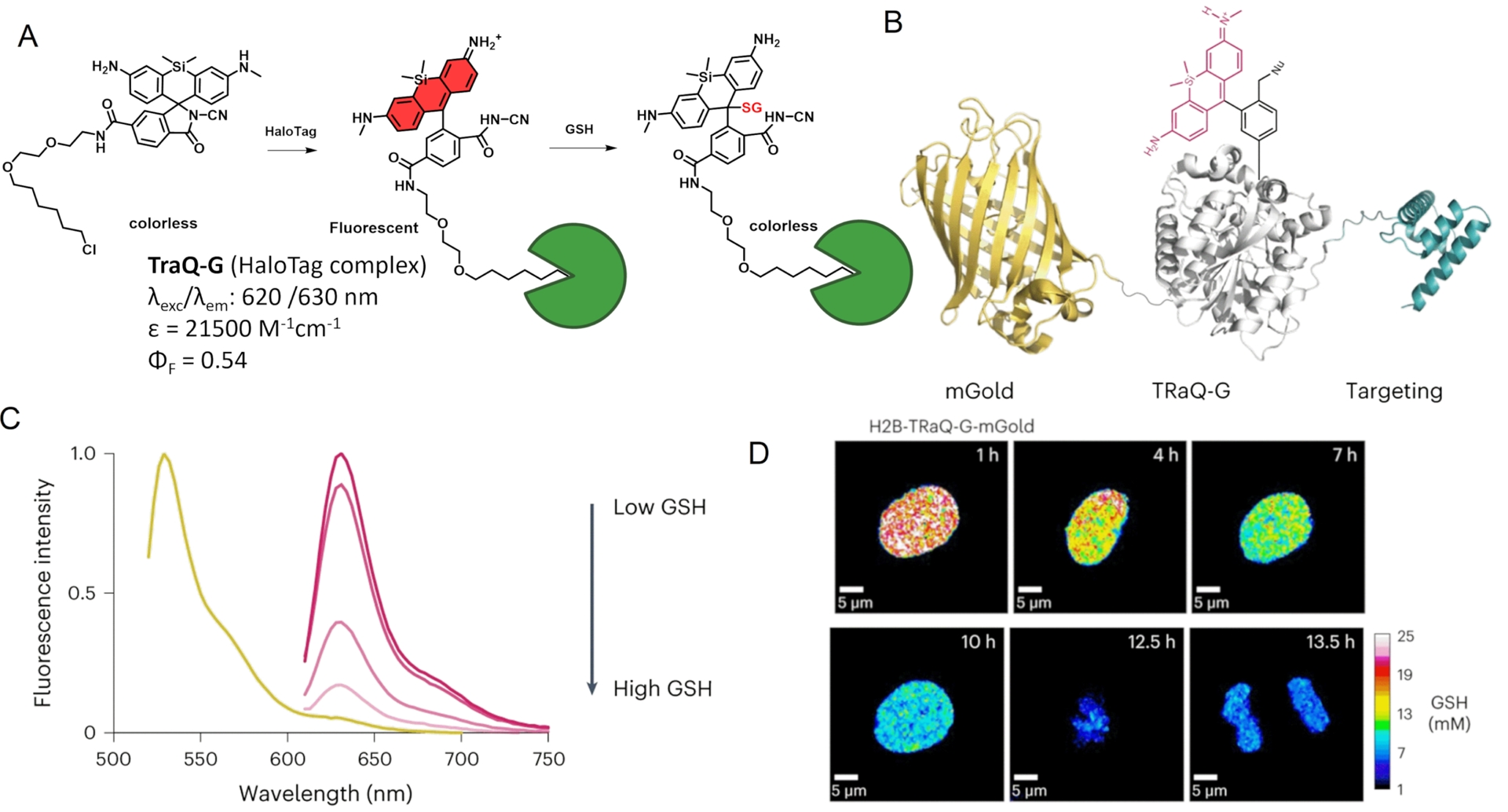 TRaQ-G dual-input glutathione sensor. (A) Principle of the TRaQ-G sensing platform. (B) Design of the ratiometric GSH sensor using TRaQ-G combined to mGold fluorescent protein. (C) Fluorescence intensity spectra of mGold–TRaQ-G ratiometric probe with varying GSH concentration. (D) Visualization of nuclear GSH concentrations during cell proliferation with H2B–TRaQ-G–mGold: images of a single HeLa nucleus showing a decrease in GSH concentration from S phase to mitosis. Image adapted from Ref. [61] under the CC BY 4.0 license.