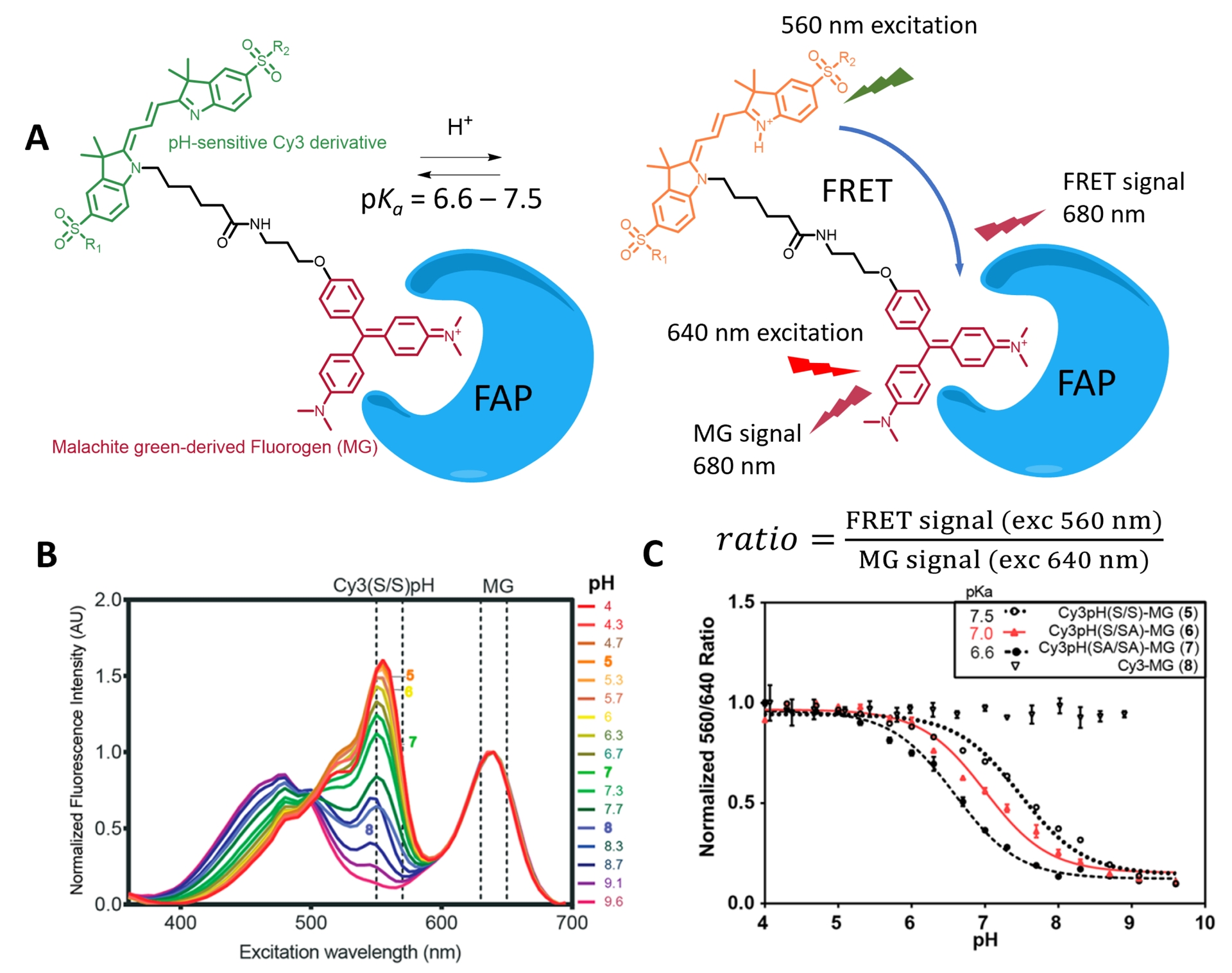 (A) Structure of the FRET-based locally activated pH indicator targeting FAP. (B) Fluorescence emission of the tandem, showing the shift in emission of the Cy3 moiety due to pH and the FRET with MG. (C) Ratiometric pH calibration curve. Adapted with permission from Ref. [63]. Copyright 2018 American Chemical Society.