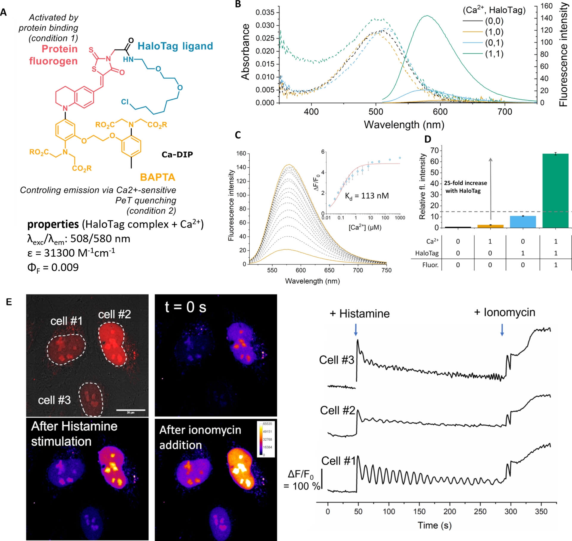 Structure and properties of the Ca-DIP sensor. (A) Structure of Ca-DIP. (B) Absorption and emission properties in the four possible states of the system with and without calcium and HaloTag. (C) Fluorimetric titration. (D) Dual-input fluorescence activation. (E) Genetically targeted calcium imaging in HeLa cells expressing HaloTag–NLS protein: a selective signal sensitive to calcium can be recorded in cell nuclei under wash-free conditions. Adapted with permission from Ref. [79]. Copyright 2022 Royal Society of Chemistry.