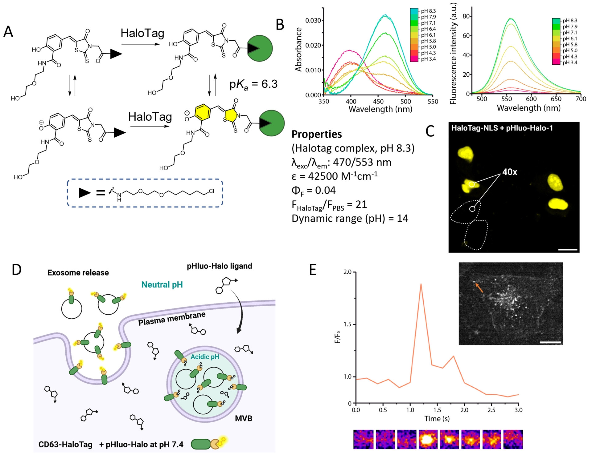Following this work on a calcium probe, we have used a similar idea to design a dual-input pH probe and develop a locally activated chemogenetic sensor to image protein exocytosis [80]. By using a phenol electron-donating group, we obtained the pH-sensitive HaloTag ligand pHluo-Halo-1 (Figure 10A). Thanks to an adjacent amide function, the pKa of the phenol was lowered to 6.3, a value adapted to measure the transition from acidic vesicles (pH 5.5) to the neutral environment (pH 7.4) during protein exocytosis (Figure 10D). As for Ca-DIP, only the HaloTag-bound form is fluorescent with 21-fold activation due to the protein, and pH modulates the ICT from the phenol with a ratiometric absorption and only one fluorescence emission originating from the phenolate form (Figure 10B). In addition to tuning the pKa, the amide function was used to introduce a hydrophilic diethylene glycol chain in order to limit the nonspecific activation in lipophilic organelles. In HeLa cells, pHluo-Halo-1 indeed exhibits remarkable labeling selectivity, with virtually no nonspecific signal under wash-free conditions (Figure 10C). It was applied to image the exocytosis of a CD63-HaloTag protein using TIRF microscopy. Moreover, comparison with the pH biosensors super-ecliptic pHluorin and pHuji showed that our hybrid sensor reported correctly on single fusion events (Figure 10D) [80].
