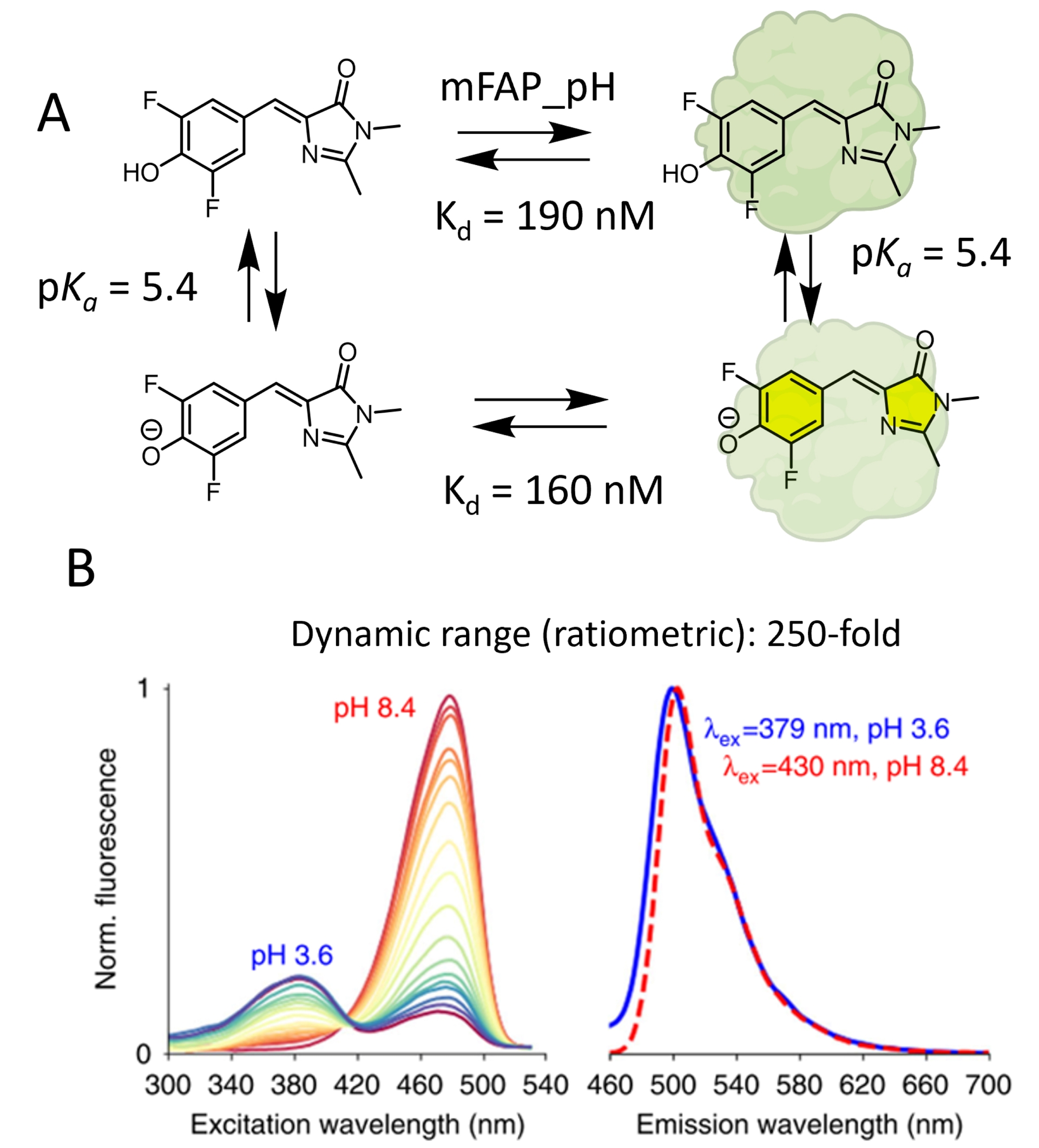 Fluorogenic chemogenetic pH sensor based on the de novo design of mFAPs. (A) Principle of DFHBI–mFAP_pH complex formation for pH monitoring. (B) Normalized fluorescence excitation spectra of the mFAP_pH–DFHBI complex for a pH titration between pH 3.6 and pH 8.4 (left) and normalized emission spectra at pH 3.6 and 8.4 (right). Image adapted from Ref. [82] under the CC BY 4.0 license.
