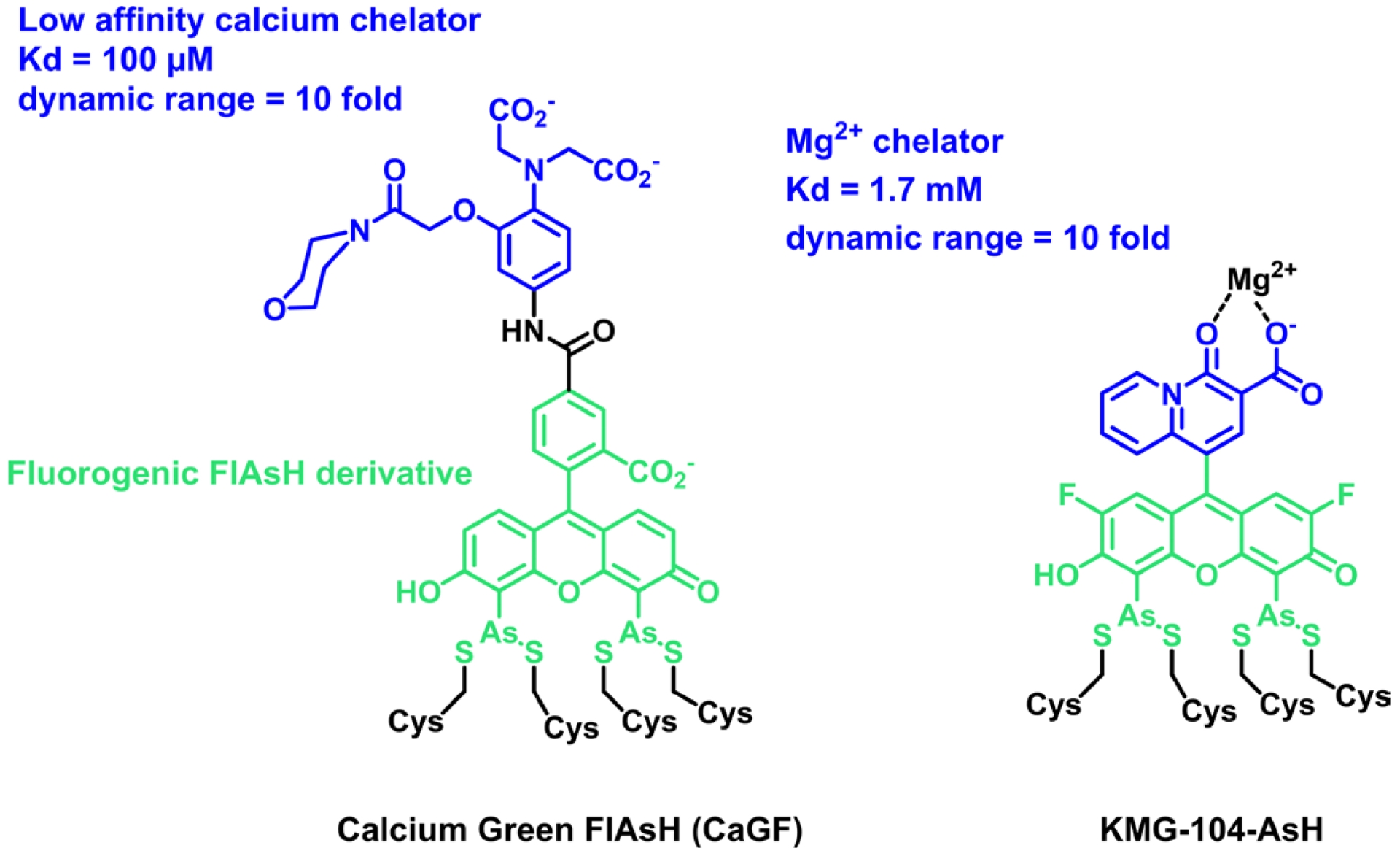 Structure of dual-input calcium and magnesium sensors based on the FlAsH fluorogenic probe.