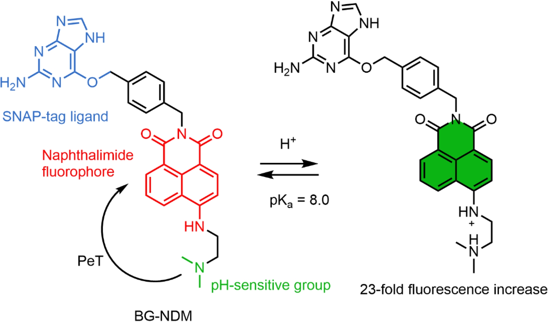 Xu and coworkers developed a semisynthetic pH probe based on the combination of 1,8-naphthalimide fluorogens (BG-NDM) targeted at SNAP-tag and incorporating an amine group that quenches the fluorescence via PeT (Scheme 2) [87]. In this design, the SNAP-tag protein activates BG-NDM by preventing fluorophore aggregation, and protonation of the amine at low pH inhibits the PeT. It is worth noting that the residual fluorescence of BG-NDM is high, and consequently, the fluorescence enhancement due to the reaction with SNAP-tag is moderate. This dual-input locally activated pH probe displays a pKa of 8.0, which is slightly high for the range of biological pH values albeit with a good dynamic response. So far this is the only example of a dual-input probe with an activation based on the aggregation ability of naphthalimide. Although it is not mentioned in this study, PeT between the benzylguanine ligand of SNAP-tag and a naphthalimide has been reported and may also contribute to the fluorogenicity of this probe and constitutes a possible strategy to design dual-input probes [88].